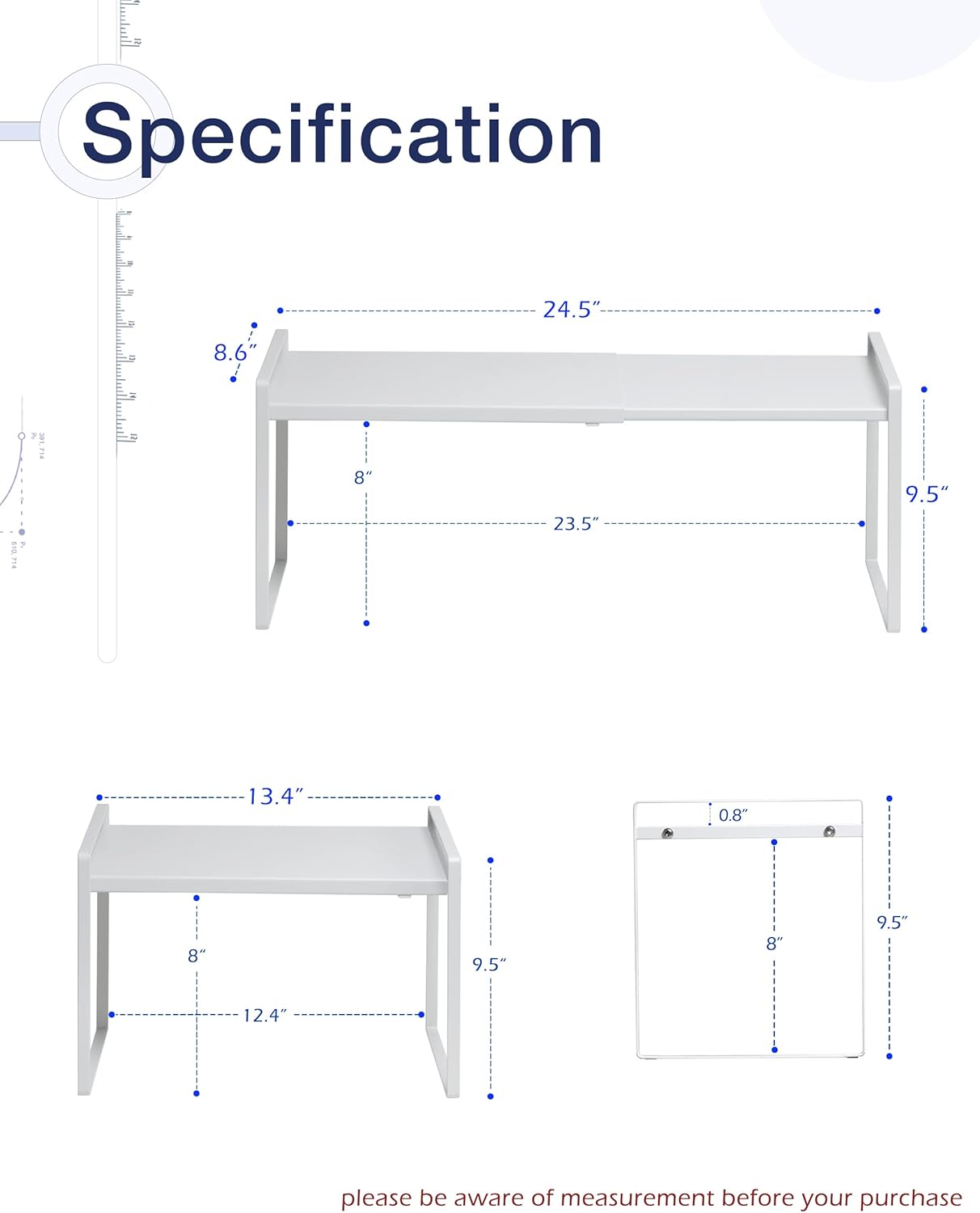 - EXPANDABLE: You may expand the width of this freestanding cabinet shelf to your desires. It can easily vary from 13.4 inches to 24.5 inches in width depending on how you want to organize your space. Specification: 8.6ββD * 13.4-24.5ββW * 9.5ββH