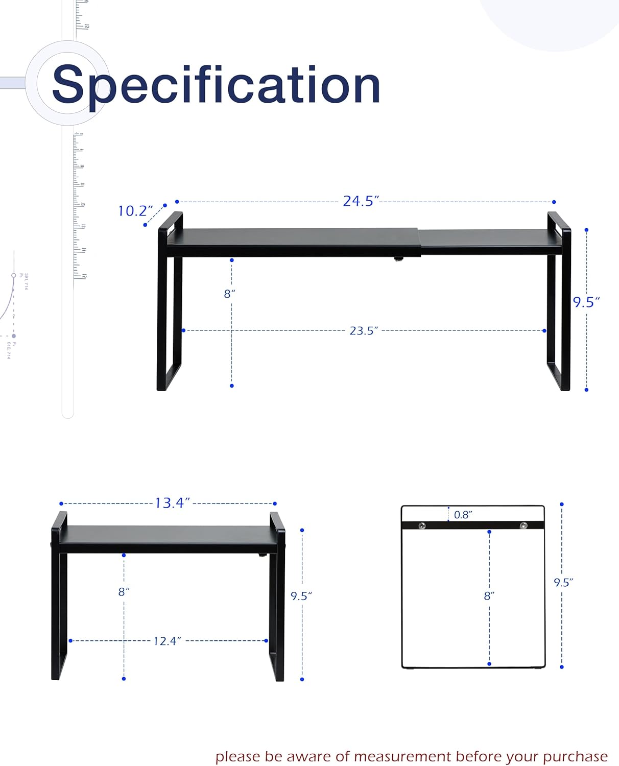 - EXPANDABLE: You may expand the width of this freestanding cabinet shelf to your desires. It can easily vary from 13.4 inches to 24.5 inches in width depending on how you want to organize your space. Specification: 10.3’’D * 13.4-24.5’’W * 9.5’’H