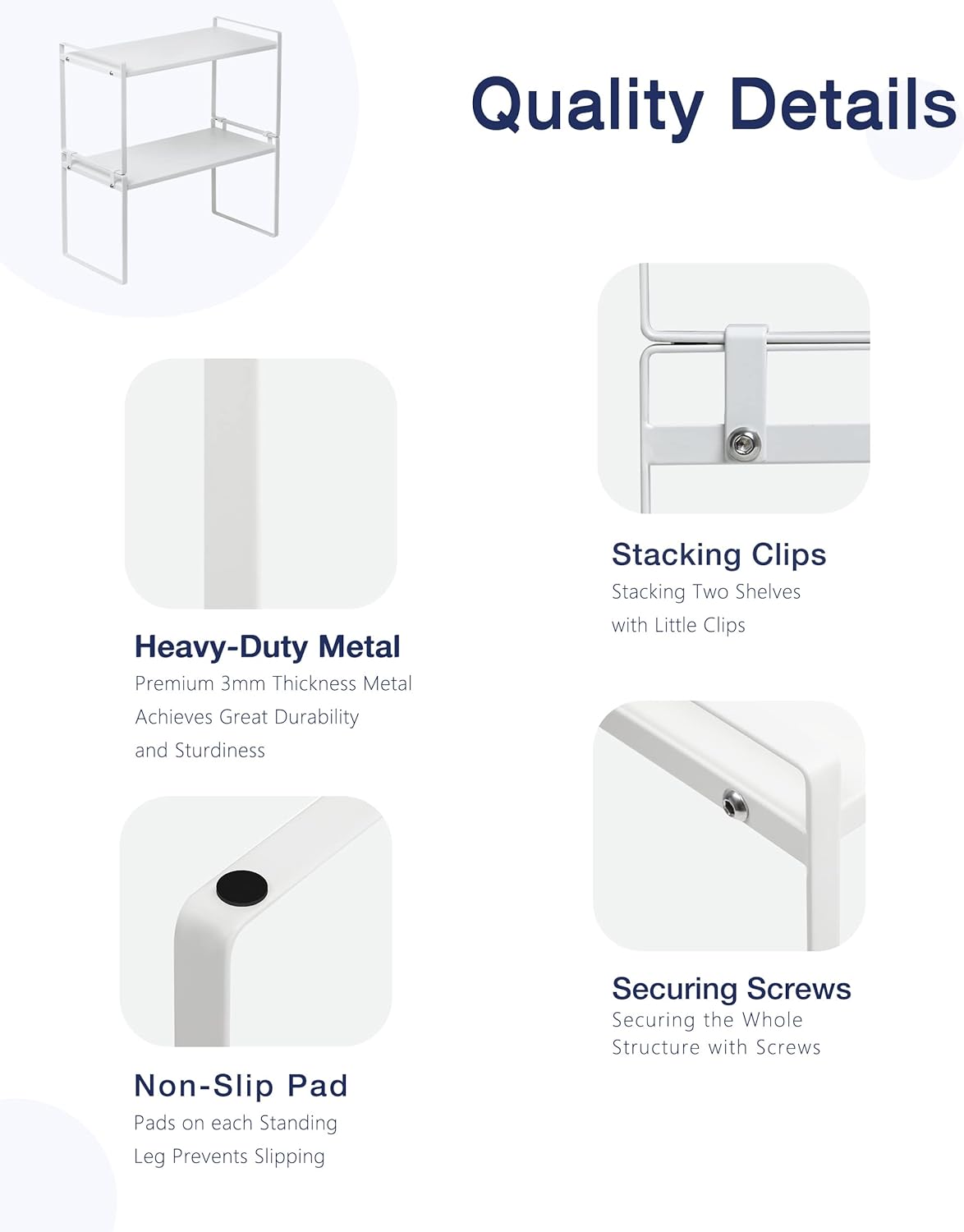 - STACKABLE: The product comes with two sets of cabinet shelves where you can stack one on top of another, creating 2-tiers double space to store household items under, in between or on the shelf. They are perfect to use as storage organizers in kitchen, cabinet, pantry, cupboard, and anywhere in your home or office for that wonderful extra storage space.