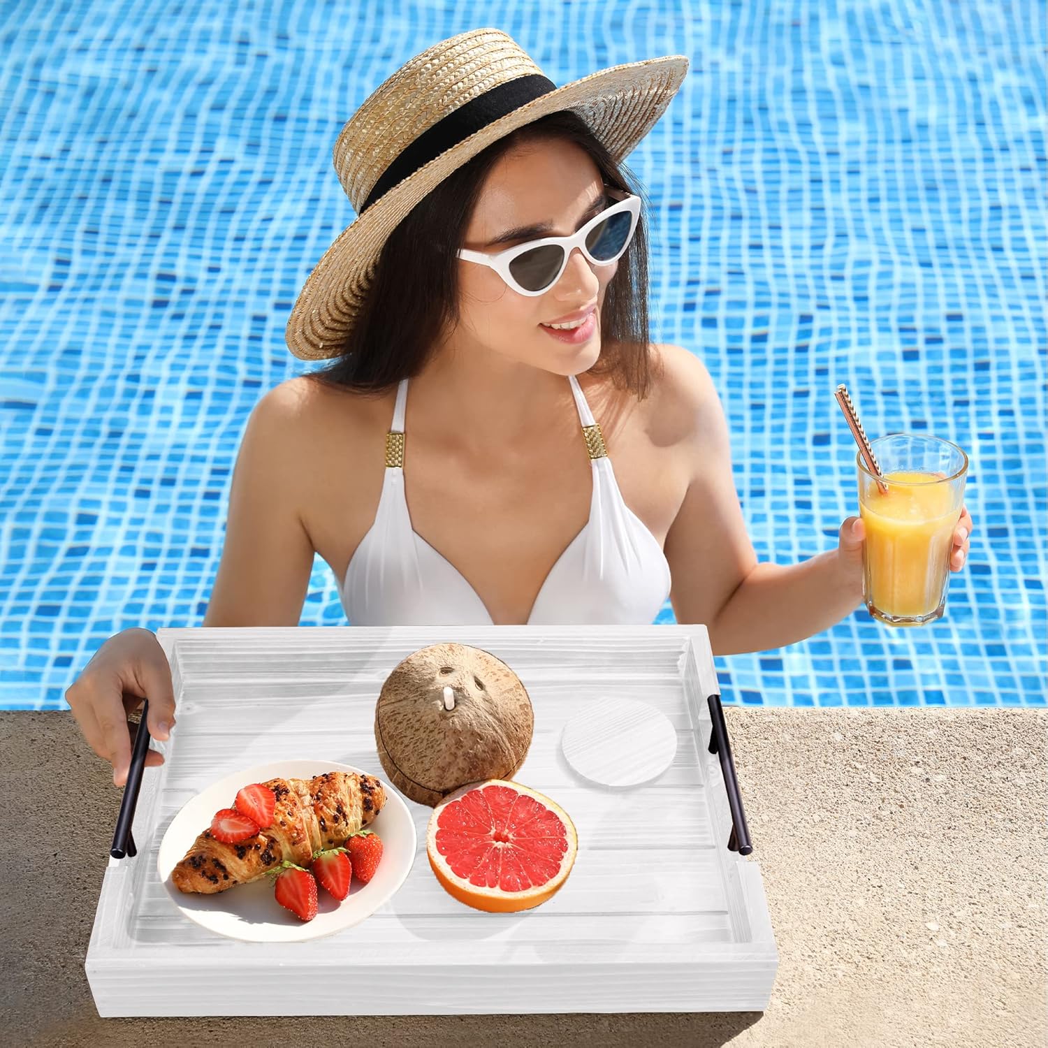 Ottoman Tray | Wooden Serving Tray with Handles & Coasters - 17x13 Inch, Rustic, White, Solid, Rectangular, Vintage, Lightweight