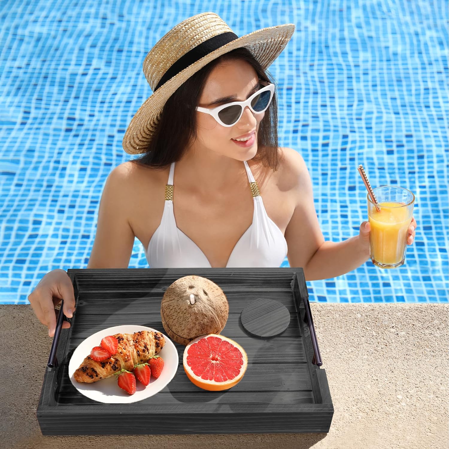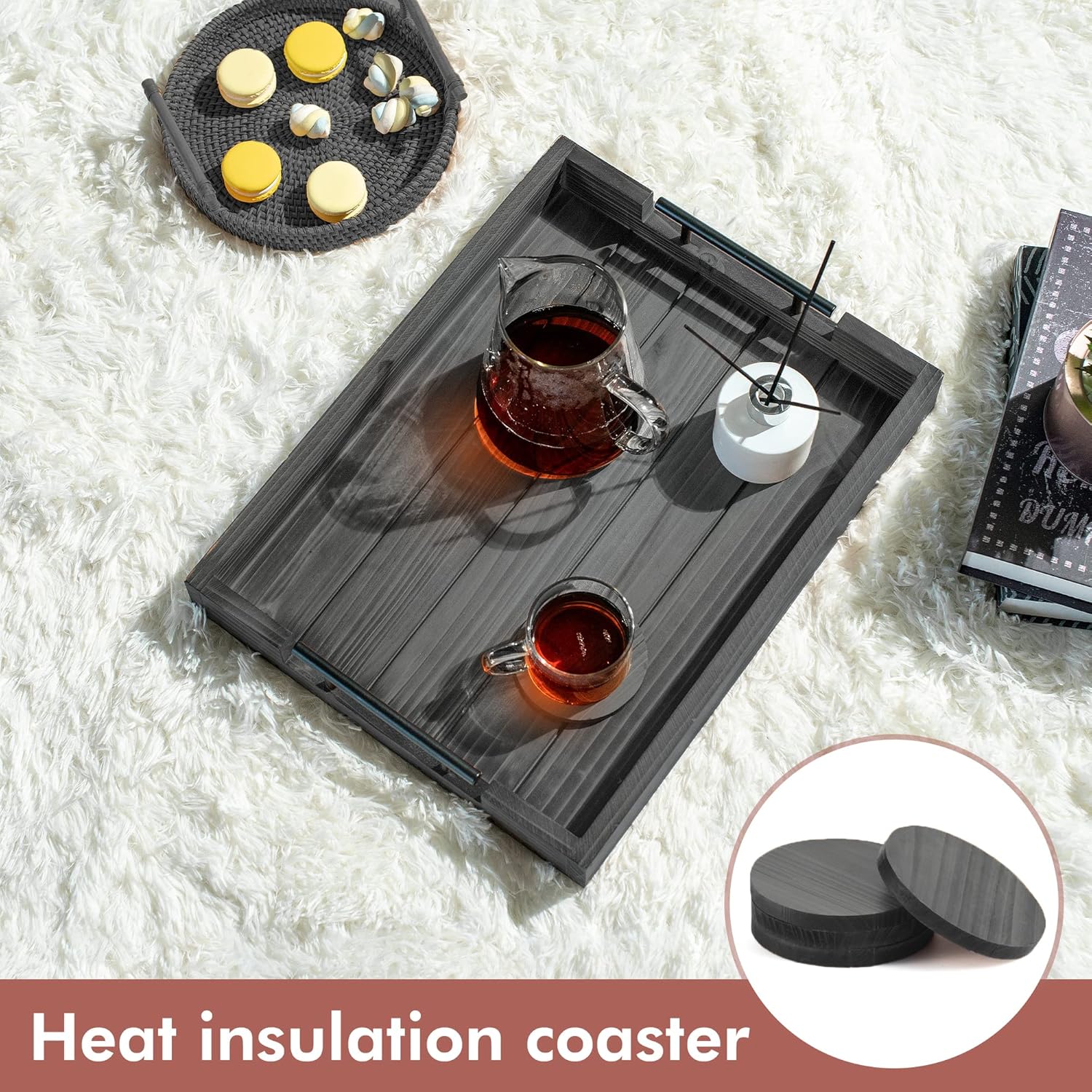 - INCLUDED WOODEN COASTERS SET OF 4 β Along with our wooden serving trays, we also provide a set of 4 natural wooden coasters that have a tasteful torched appearance. These wooden coasters for drinks are the best way to protect your tables from spills, mess, and stains while also adding a decorative element to your home, uplifting the overall aesthetic appeal β MUST HAVE ottoman tray with handles can be used as a Drink Tray!