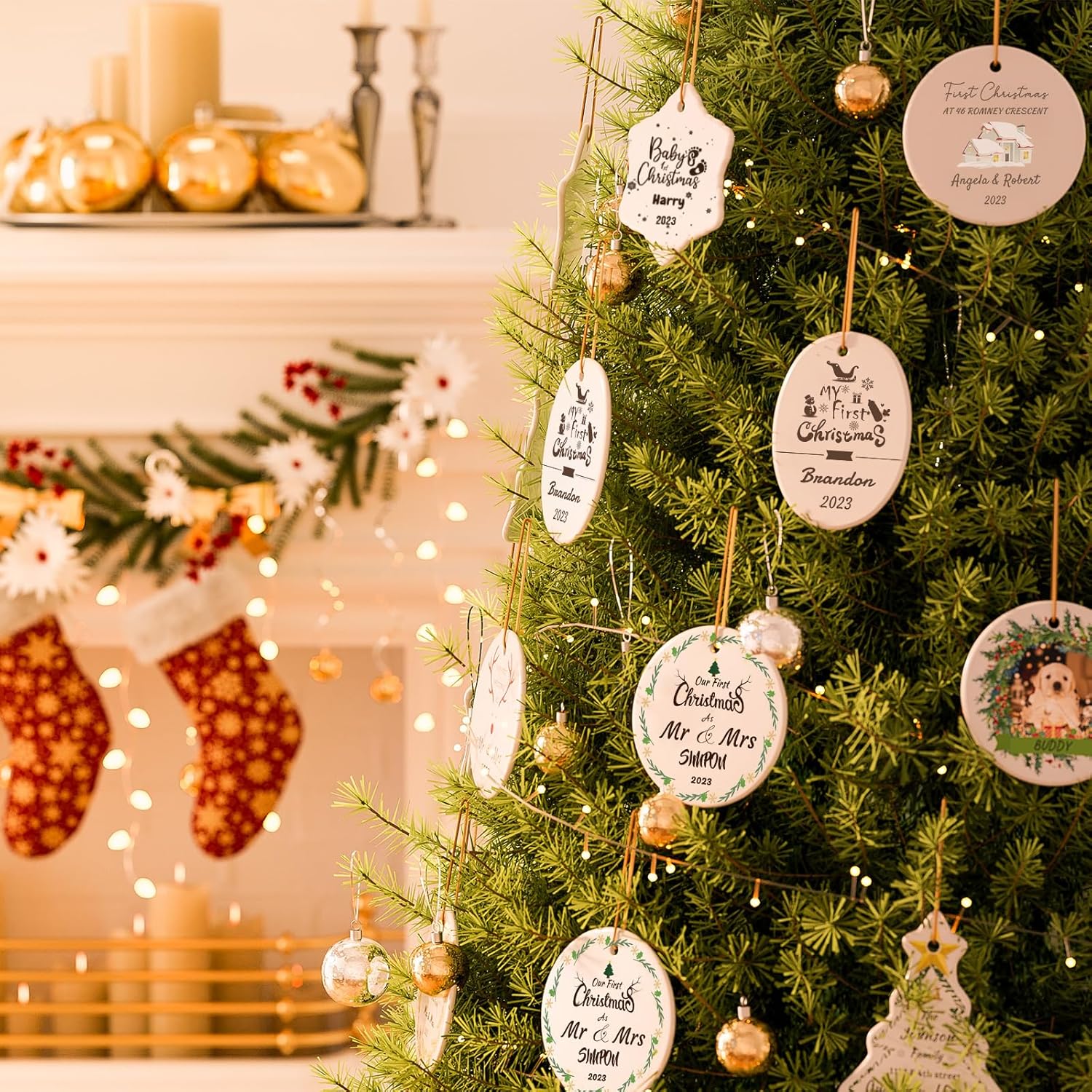 - PERFECT CHRISTMAS DECORATION - This beautiful handcrafted personalized Christmas decoration is a perfect way to hang on your Christmas tree. Gold hanging cord included, the best decoration for Christmas trees, doors, windows, walls and anywhere you want to decorate. Your personalized family ornaments will make your Christmas decorations indoor feel extra special and unique to your family home