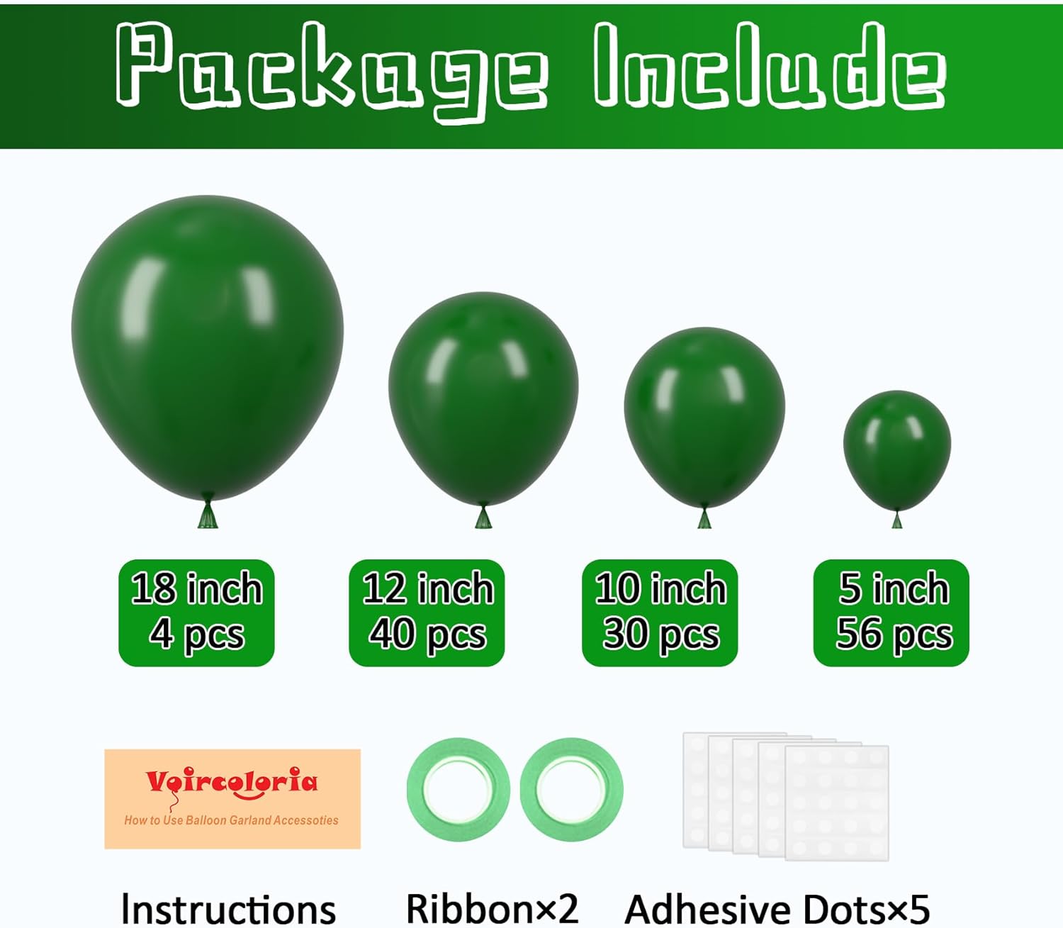- Dark Green Balloons: 130pcs set includes 56 5" balloons, 30 10" balloons, 40 12" balloons, 4 18" balloons, ribbon and adhesive dots for easy assembly.