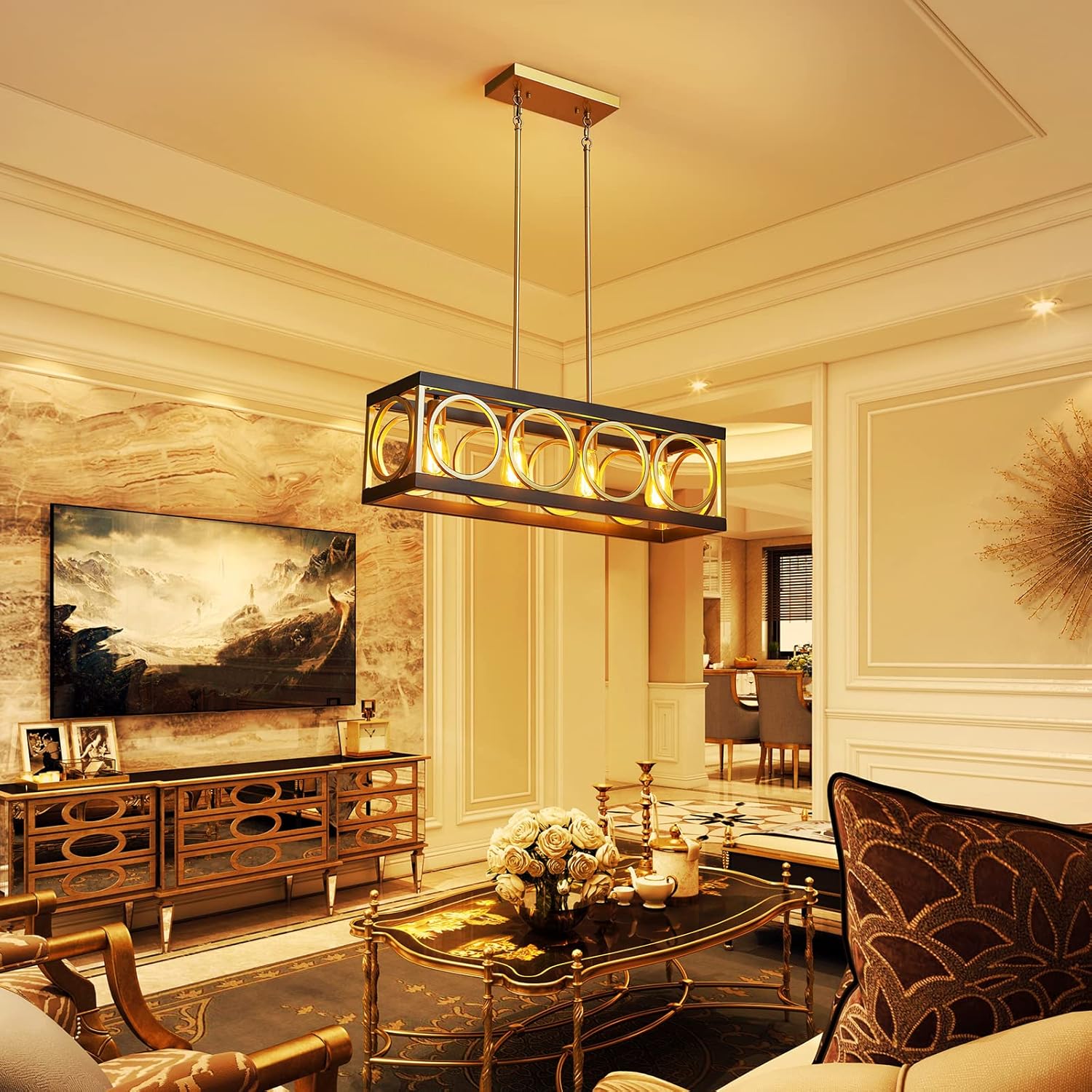- [UNIQUE PENDANT LAMP]The open-cage farmhouse dining room light fixture features a rectangle frame in black and gold finish metal with a barn-inspired circular design stretching across each side, recalling reminiscent of classic, coastal and vintage aesthetics.