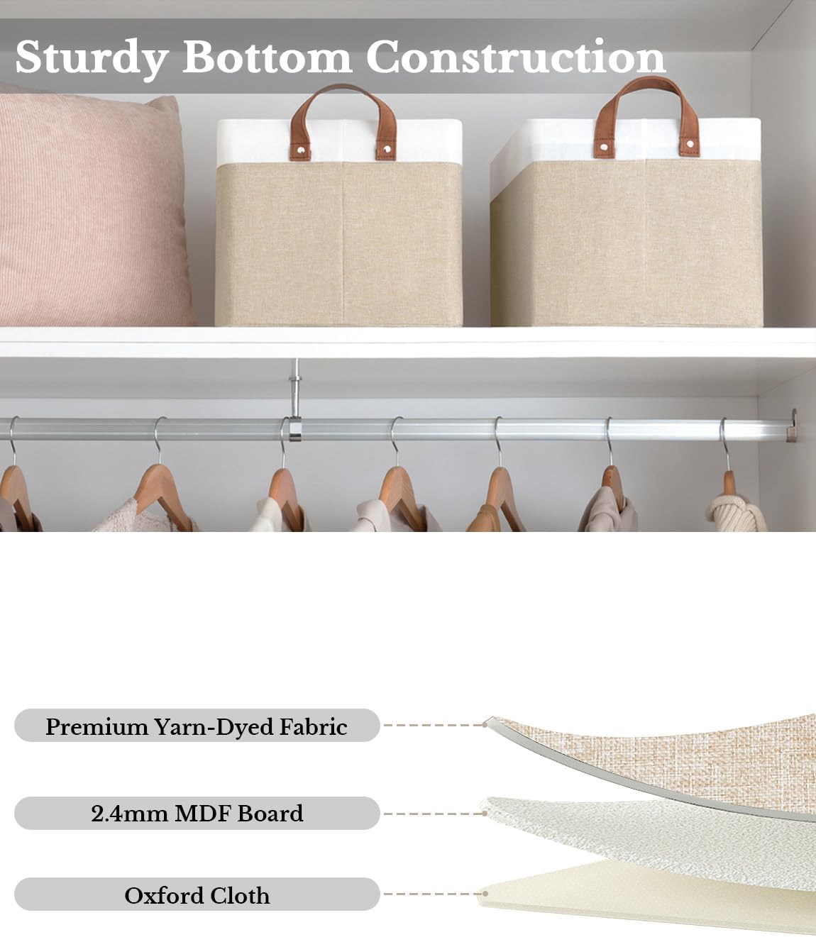- Premium Quality: Made from high-quality fabric and reinforced with a heavy-duty MDF bottom board and a sturdy metal frame. The solid construction enables the storage bins to stand upright without support, even when empty.