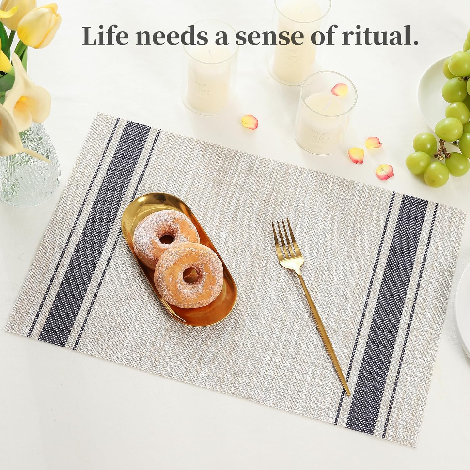 - Elegant and Practical Design: With a luxurious vinyl woven texture, precision cutting, and heat-trimmed edges, our double-sided placemats offer a sophisticated and practical solution. They provide a non-slip surface, resist fading, and are easy to clean, elevating your dining experience.