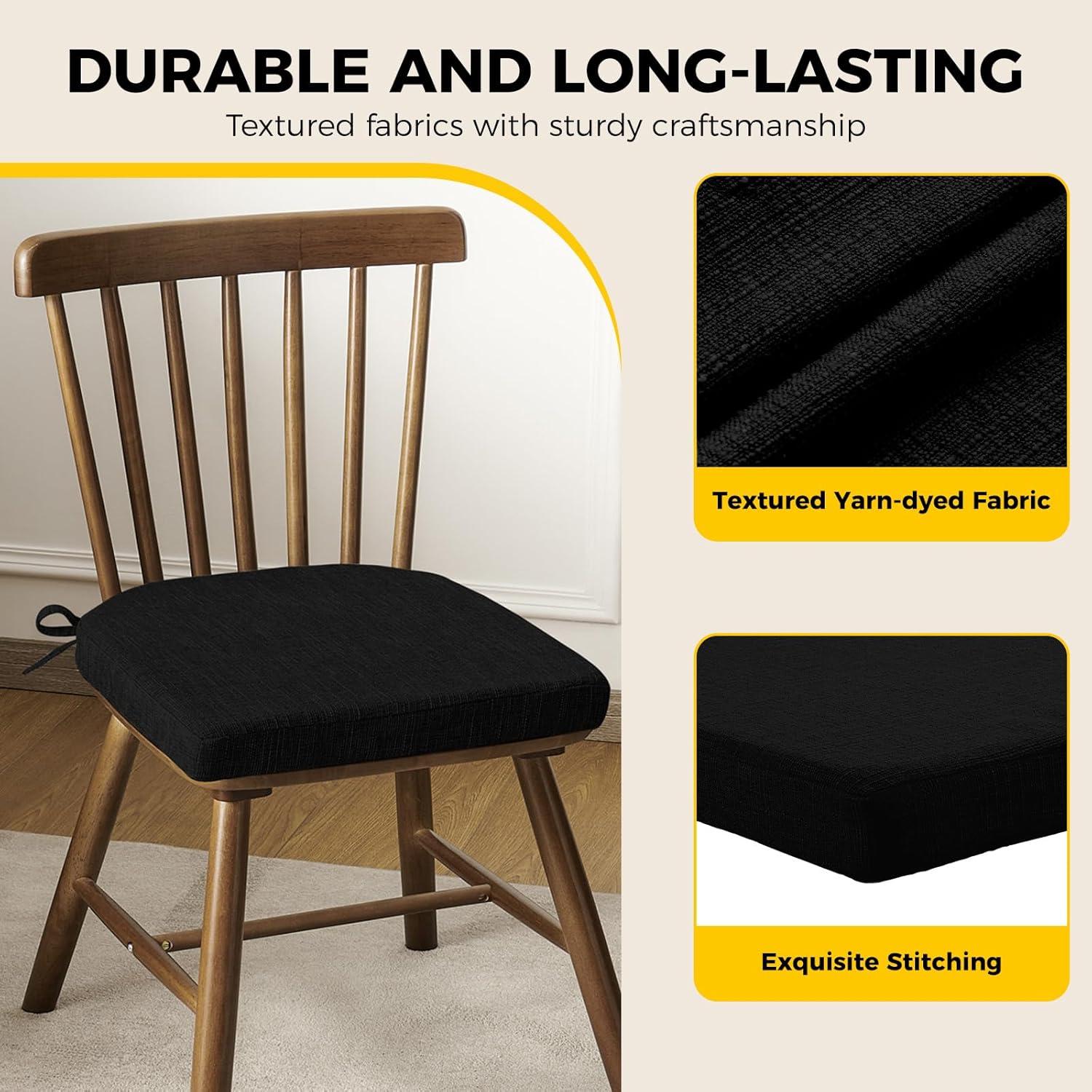 downluxe Indoor Chair Cushions for Dining Chairs, Soft and Comfortable Textured Foam Kitchen Chair Pads with Ties and Non-Slip Backing, 16" x 16" x 2", Black, 4 Pack