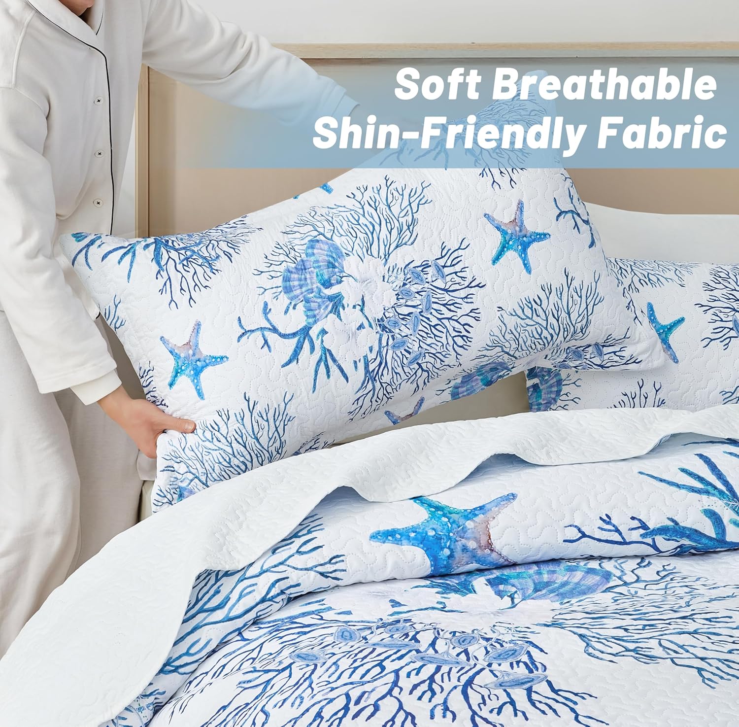 - 【Soft Material】 Soft and the cozy coastal bedding are made of top quality 100% microfiber material, which is ultimate softness and comfort. Compared with traditional stitching technology, the new technology makes the quilted coverlet more breathable and lightweight. Tight seams of coastal bedspread will not unravel.