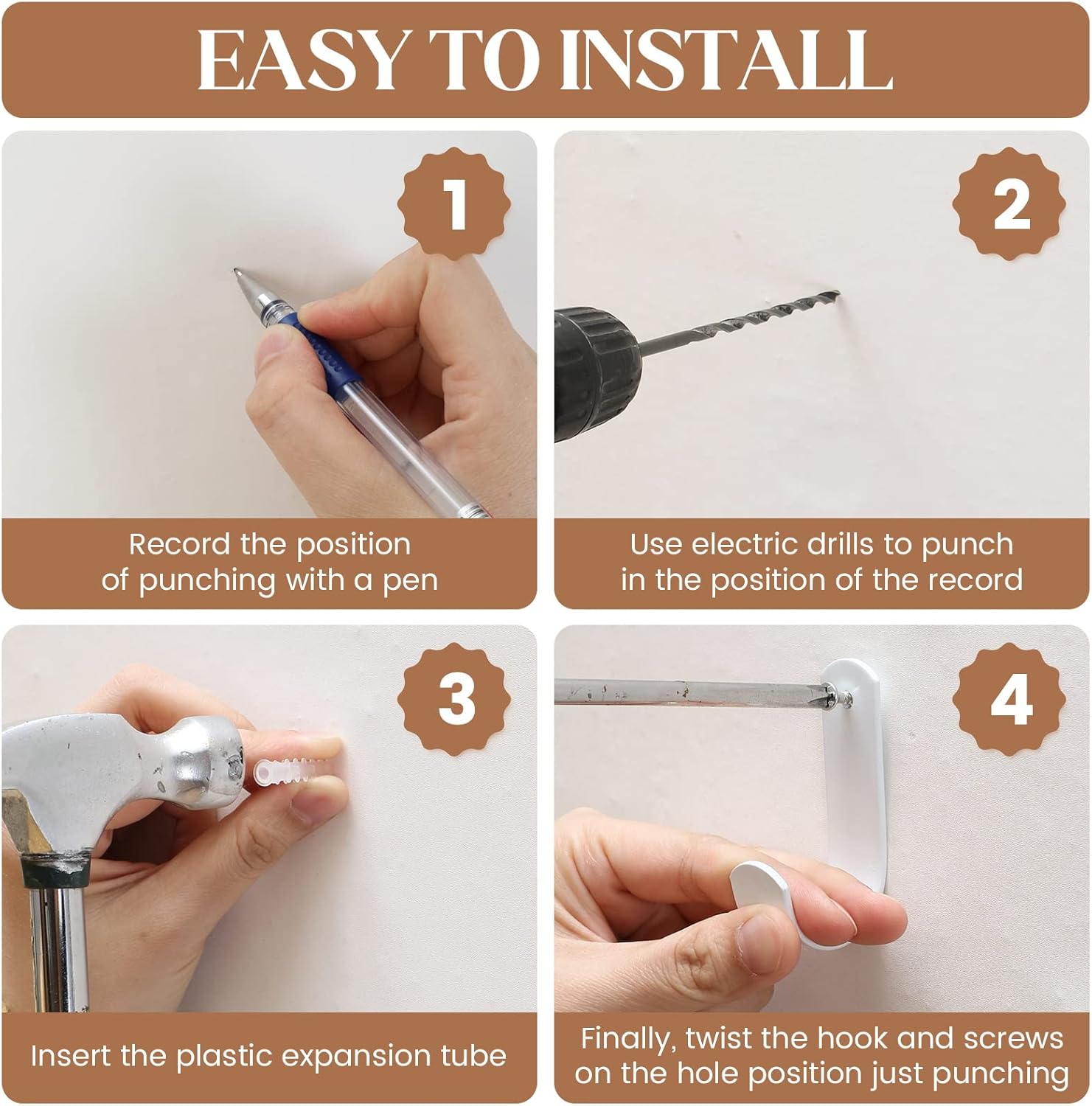 - 【Easy To Install】 - Equipped with 6 strong hooks, including 3 Pcs traceless transparent hooks(bear up to 22 LB), and 3 Pcs White space aluminum hooks, which are needed to drill holes for installation. But it is easy to assemble(The Steps show as the picture). Warm Tips: If you don't want to drill or your product weight is less than 22 LB, you can transparent hooks directly. Save your time!