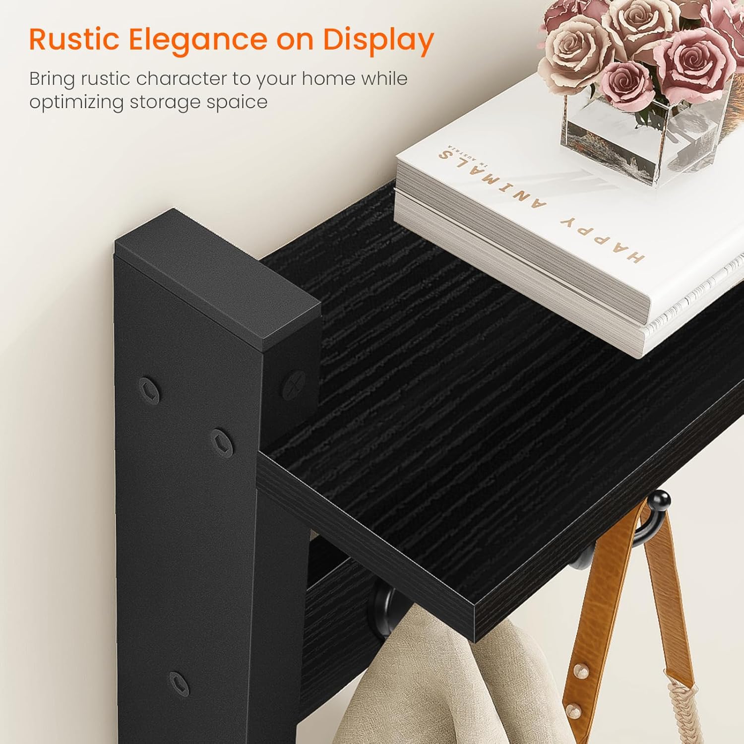 - 2-IN-1 DESIGN: With a 24" long 4.52" deep top shelf, the wall coat hanger offers additional storage space for displaying photo frames, potted plants, and other collectibles, while the 5 tri hooks underneath provide ample storage for clothes, bags, keys, umbrellas, and more