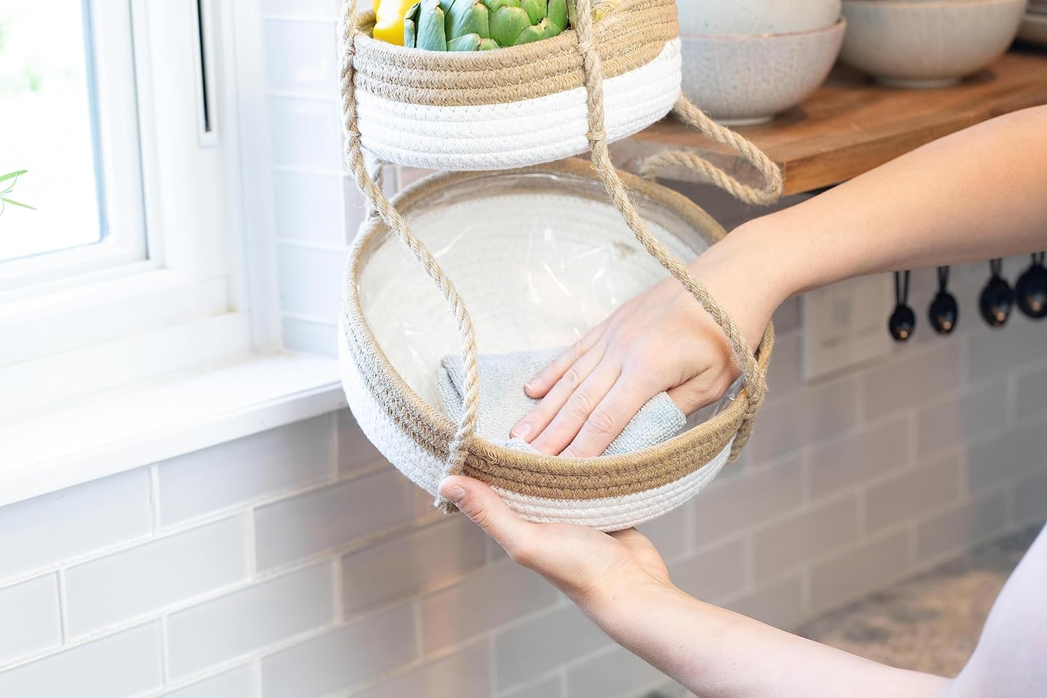 - π Durable Woven Fruit Basket Stands The Test Of Time: Our 3 tier fruit basket is crafted of strong cotton rope and comes with a sturdy jute rope. It is spacious enough for a large amount of fruit and will safely hold all your produce.