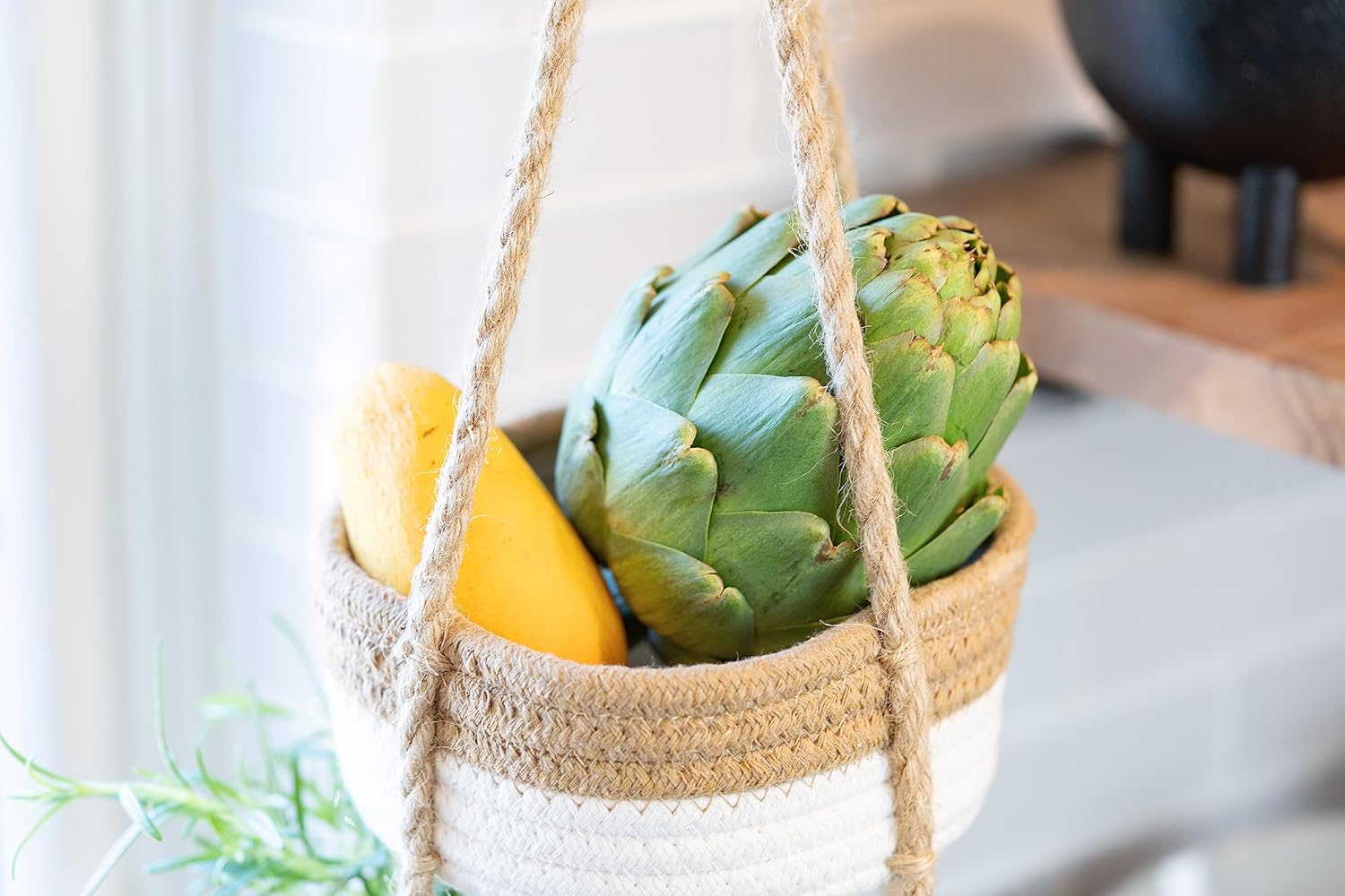 - π Decorate Your Kitchen, Living Room, Or Office: Hanging on the wall or ceiling, this elegant jute hanging basket will add natural style to any room of your house. Offered in neutral tan and white colors, it matches your rustic, boho, or farmhouse decor.