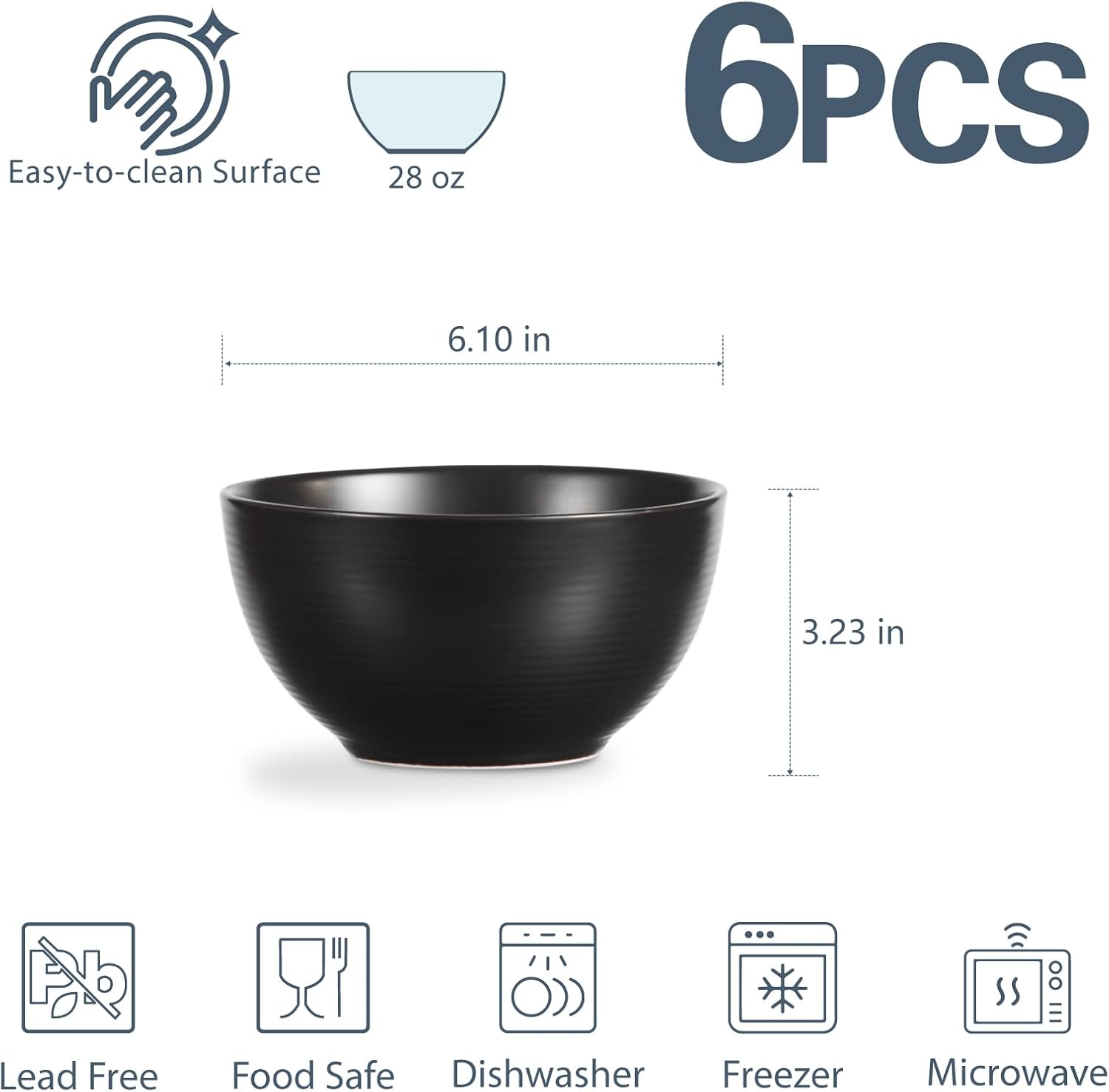 ONEMORE Cereal Bowls Set of 6, 28 oz Large Soup Bowls for Kitchen 6 inch Ceramic Salad Bowls Microwave Dishwasher Safe Deep Serving Bowl Set for Salad Dessert Rice, Black