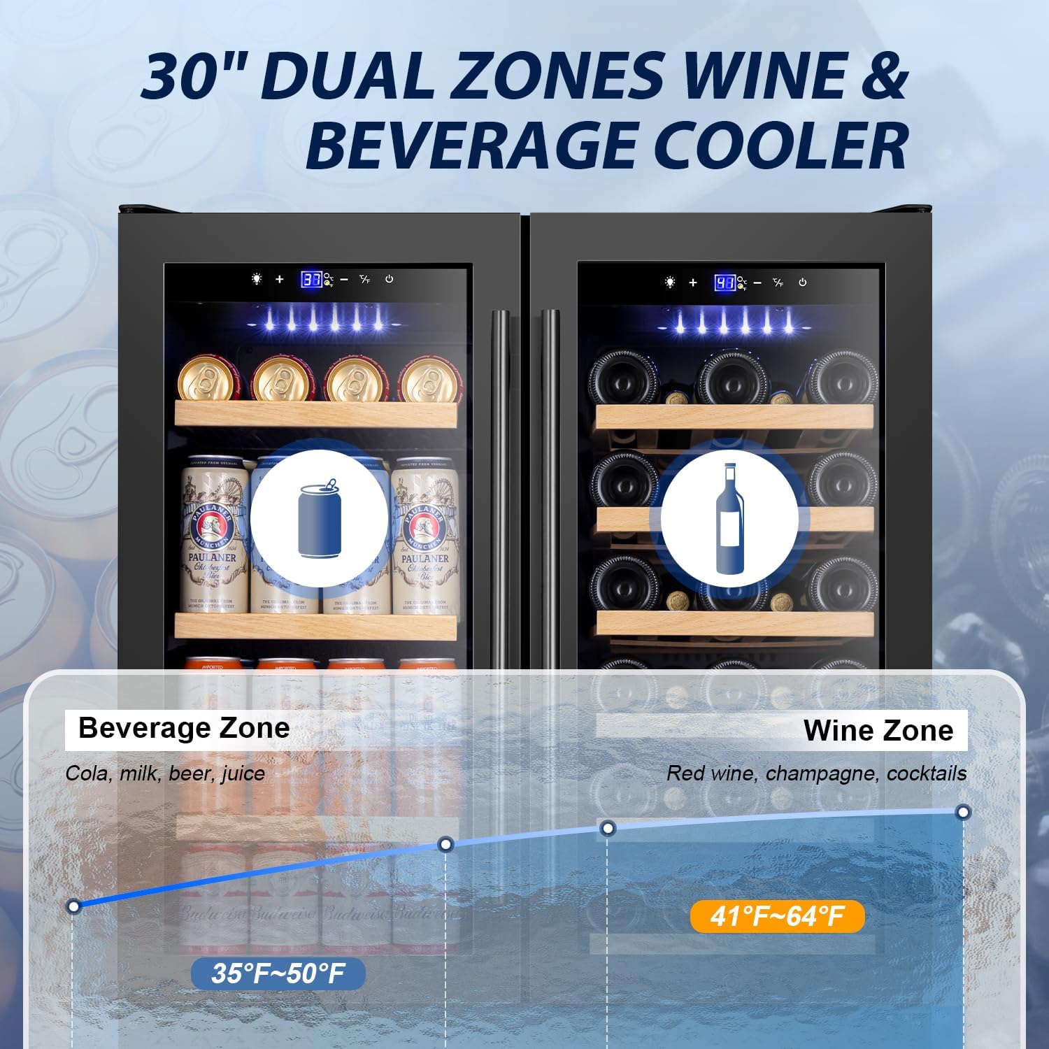 - [2-in-1 Dual Zone Wine and Beverage Fridge] Get complete control over your wine and beverage cooling with our dual-zone fridge. The left zone chills wine between 35-50°F, while the right zone cools beverages from 41-64°F. With a generous capacity of up to 29 wine bottles and 110 cans, you can effortlessly store and chill all your favorite drinks at their ideal temperatures
