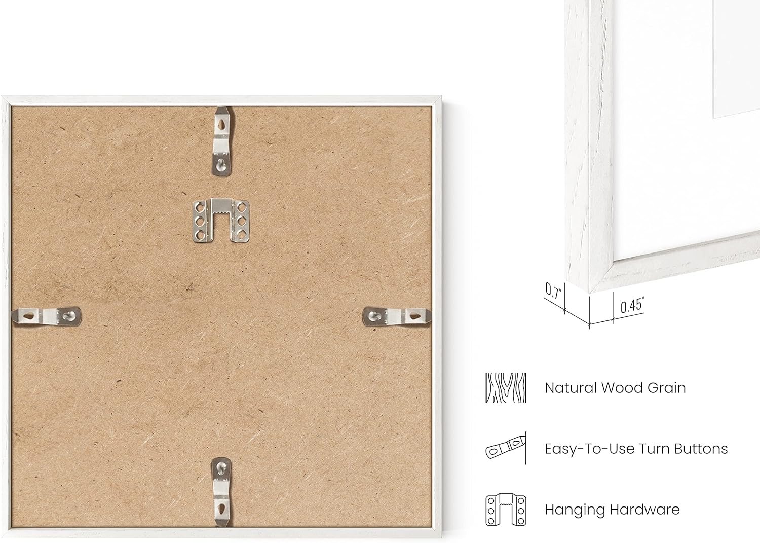- WHITE PICTURE FRAMES: Our square photo frame with mat is meticulously constructed using natural oak wood, known for its timelessness and durability. The slim profile of the white frames gallery wall effortlessly blends into any interior decor, adding a contemporary touch. The clean lines and sleek design make the 10x10 picture frames white a perfect choice for those seeking a stylish, understated display solution