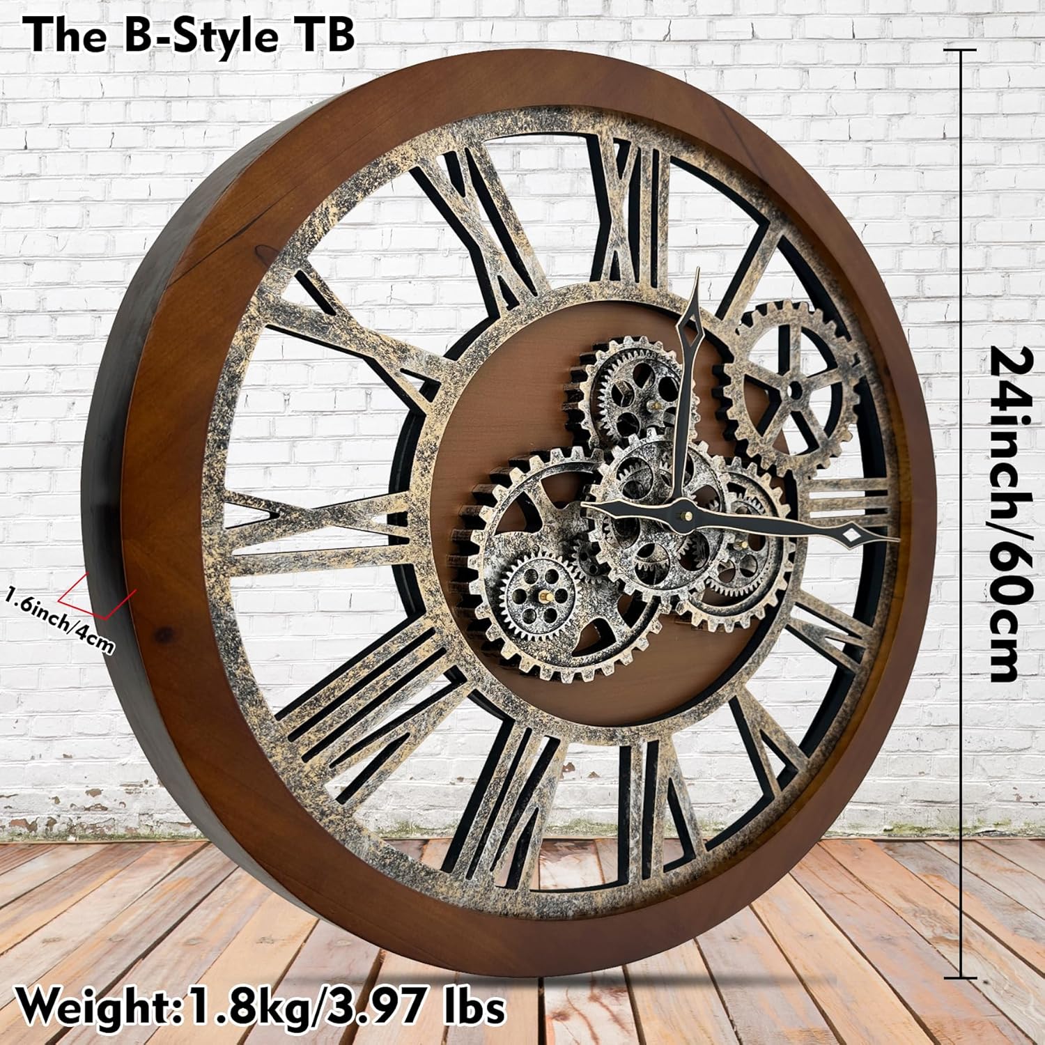 The B-Style Large Wall Clock 24 inch Moving Gear Wall Clock Oversized Vintage Farmhouse Wall Clocks for Living Room Decor Rustic Industrial Wood Clock (Drak Brown and Bronze)