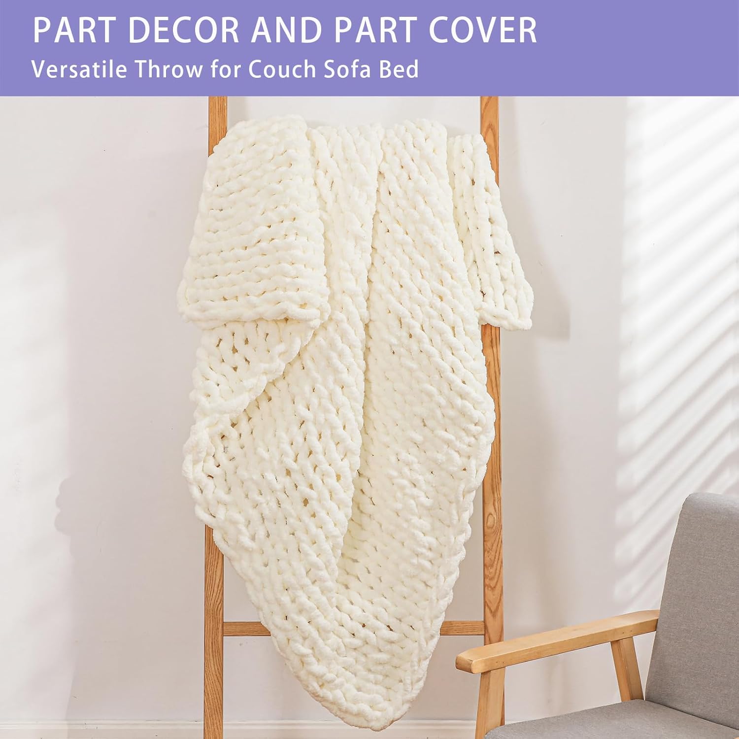 Bigacogo Chunky Knit Throw Blanket for Couch, 60x80 inches, 100% Hand Knitted with Thick Jumbo Chenille Yarn, Cozy Soft Large Rope Knot Cable Crochet Blankets for Sofa Bed Living Room, Ivory