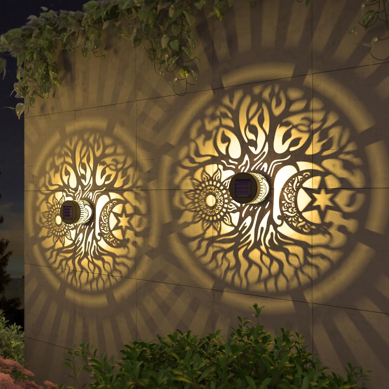2 Pack Solar Fence Lights Metal Solar Powered Outdoor Wall Deck Step Lights Tree Theme Waterproof Fence Light for Garden Post Patio Backyard Yard Decor (Tree, 2 Pack)