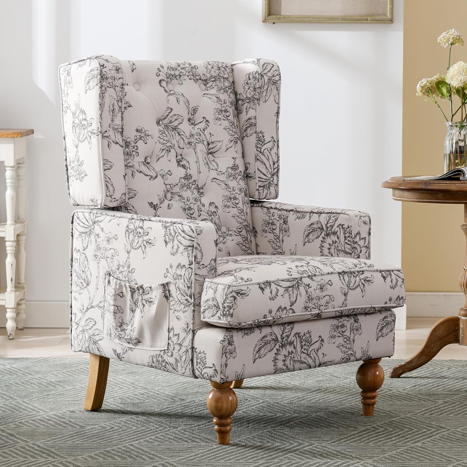 DUOMAY Tufted Accent Chair Set of 2, Modern Linen Upholstered Wingback Side Arm Chair for Living Room Bedroom with Wood Legs, Comfy Reading Guest Chair for Office, Beige Flower Pattern
