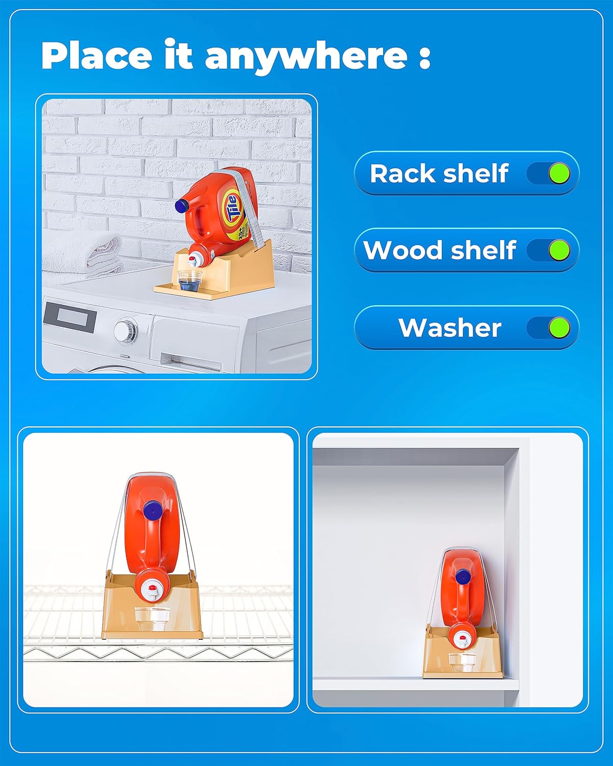 - [Safe Attachment:] The laundry detergent shelf or holder features a secure strap that firmly attaches and ensures your detergent bottle stays in place and minimizing the risk of accidental falls and spills.