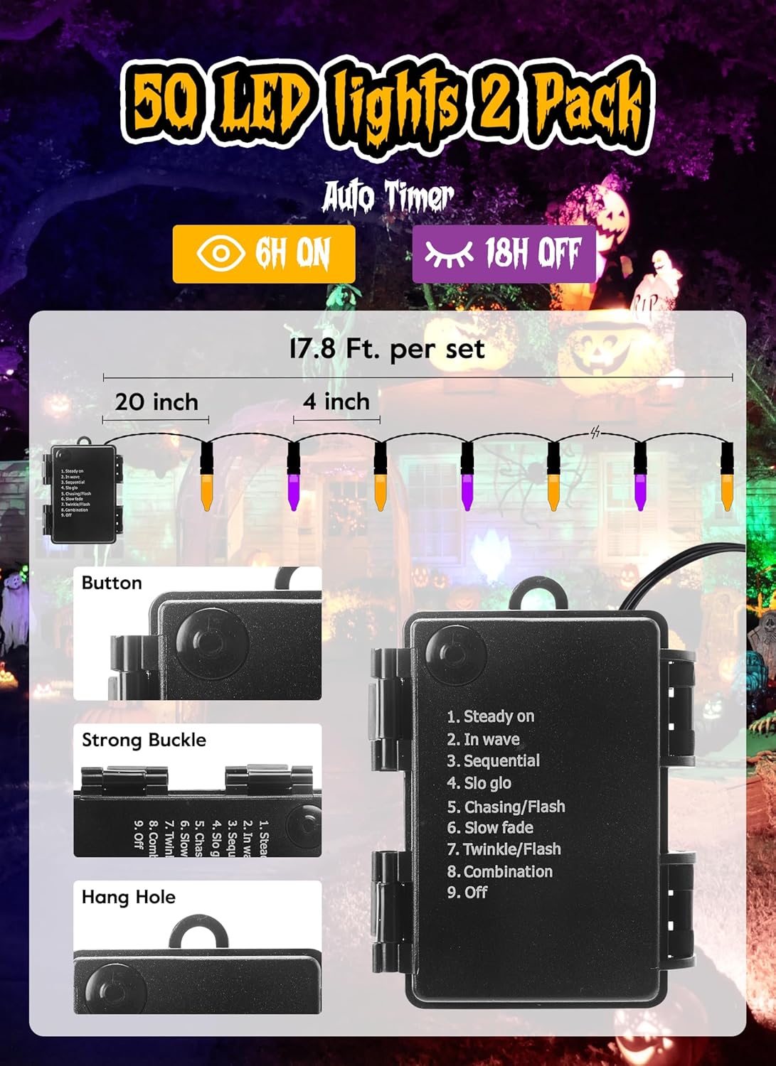 - 【8 Preset Modes】Fantastic lighting effects of these Halloween lights, adapting to desired occasions or events: press the button on the control box repeatedly to select 1. steady on, 2. in wave, 3. sequential, 4. slow-glow, 5. chasing/flash, 6. slow fade, 7. twinkle/flash or 8. combination