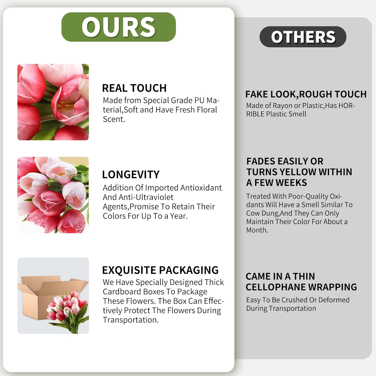 - High-Quality PU Material:Our artificial tulips are made of high-quality PU material,providing a soft touch just like real flowers,the realism is impressive. Completely eliminating the issue of plastic or chemical smells,making the flowers more environmentally friendly and harmless to the human body.