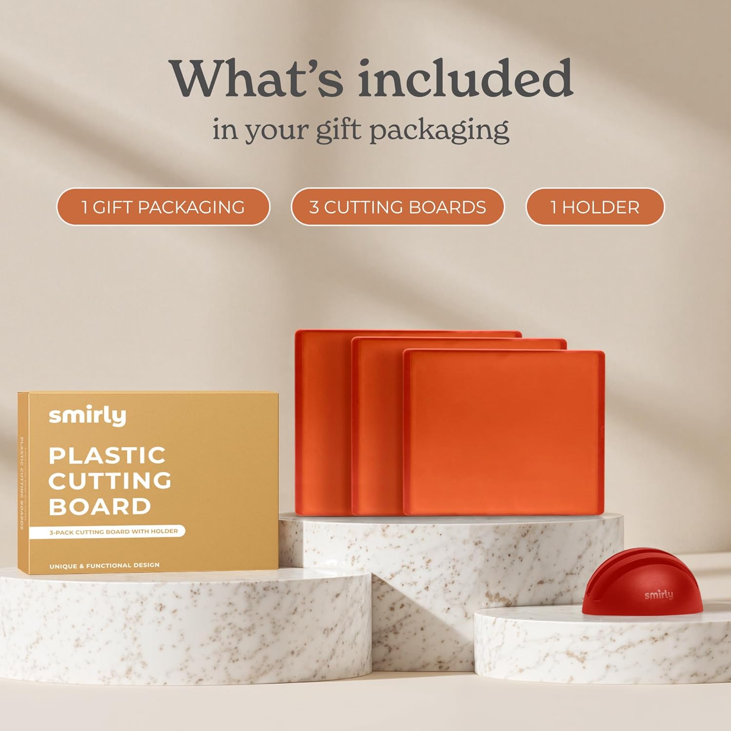 SMIRLY Plastic Cutting Board Set with Holder 3 Pieces, Non-Slip Dishwasher Safe Chopping Boards for Kitchen, Orange