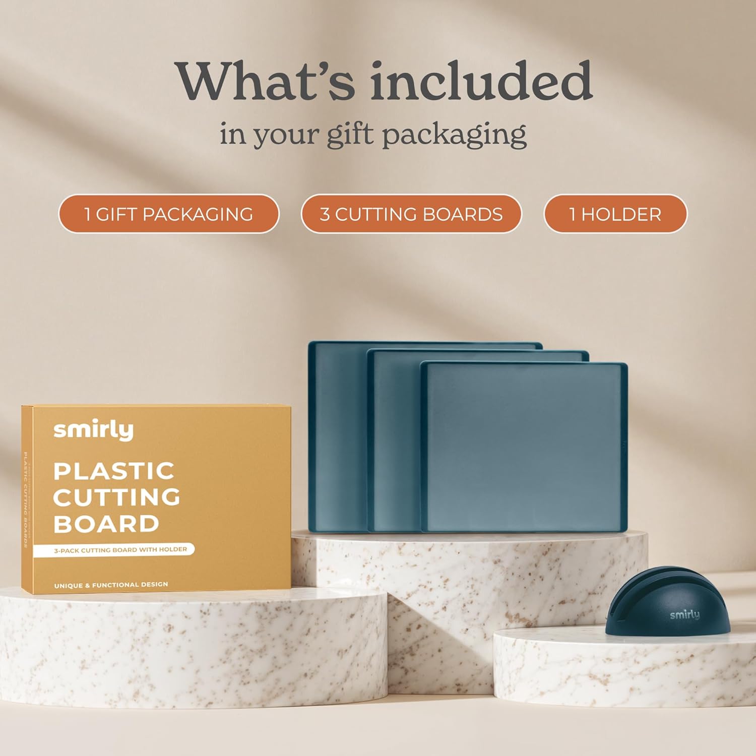 SMIRLY Plastic Cutting Board Set with Holder 3 Pieces, Non-Slip Dishwasher Safe Chopping Boards for Kitchen, Blue