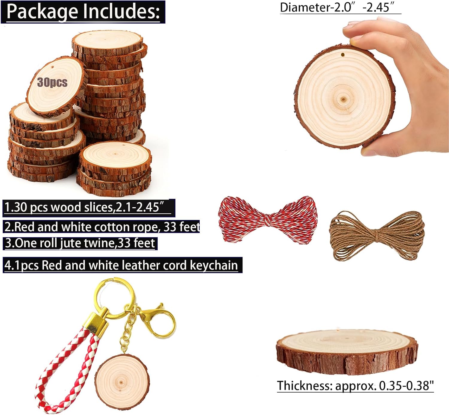 - A Rainbow of Possibilities - Our unfinished wood crafts are the perfect blank canvas for your imaginative ideas. Use these wooden circles for crafts to create personalized items or add a unique touch to your home decor. Bonus Keychain Included - Along with 30 wood slices, each package also comes with an additional tree slice attached to a charming keychain . Add a personal touch to your keys or bag, or give it as a thoughtful, handmade gift.