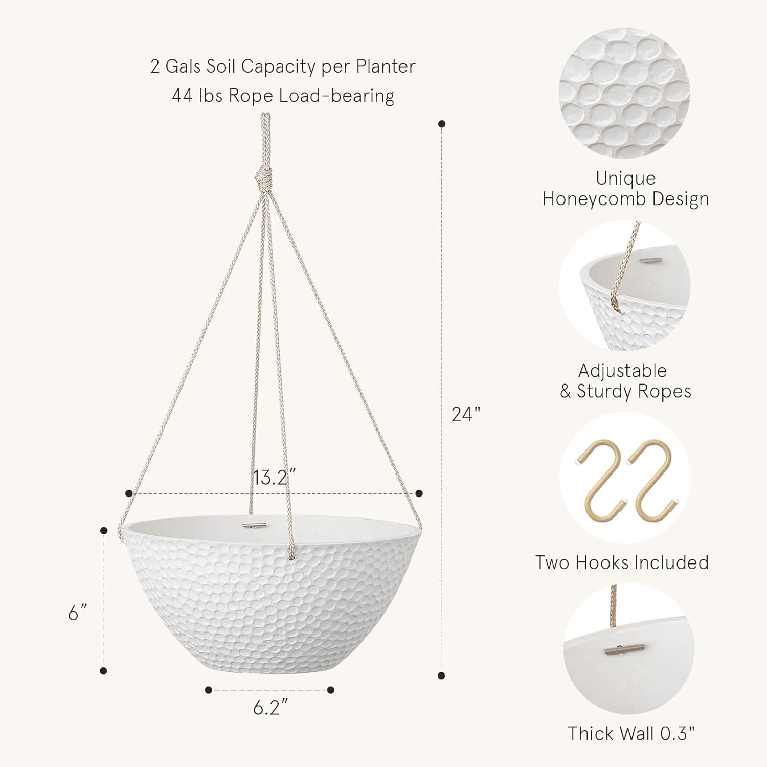 - HONEYCOMBED DESIGN HANGING PLANTER - This 2-gallons large hanging planter set (13.2” Upper D * 6” H * 6.2” Bottom D) featuring a unique honeycomb finish is an ideal way to enjoy your favorite greenery. You will love this exquisite design adorning outdoor areas such as the patio, balcony or garden.