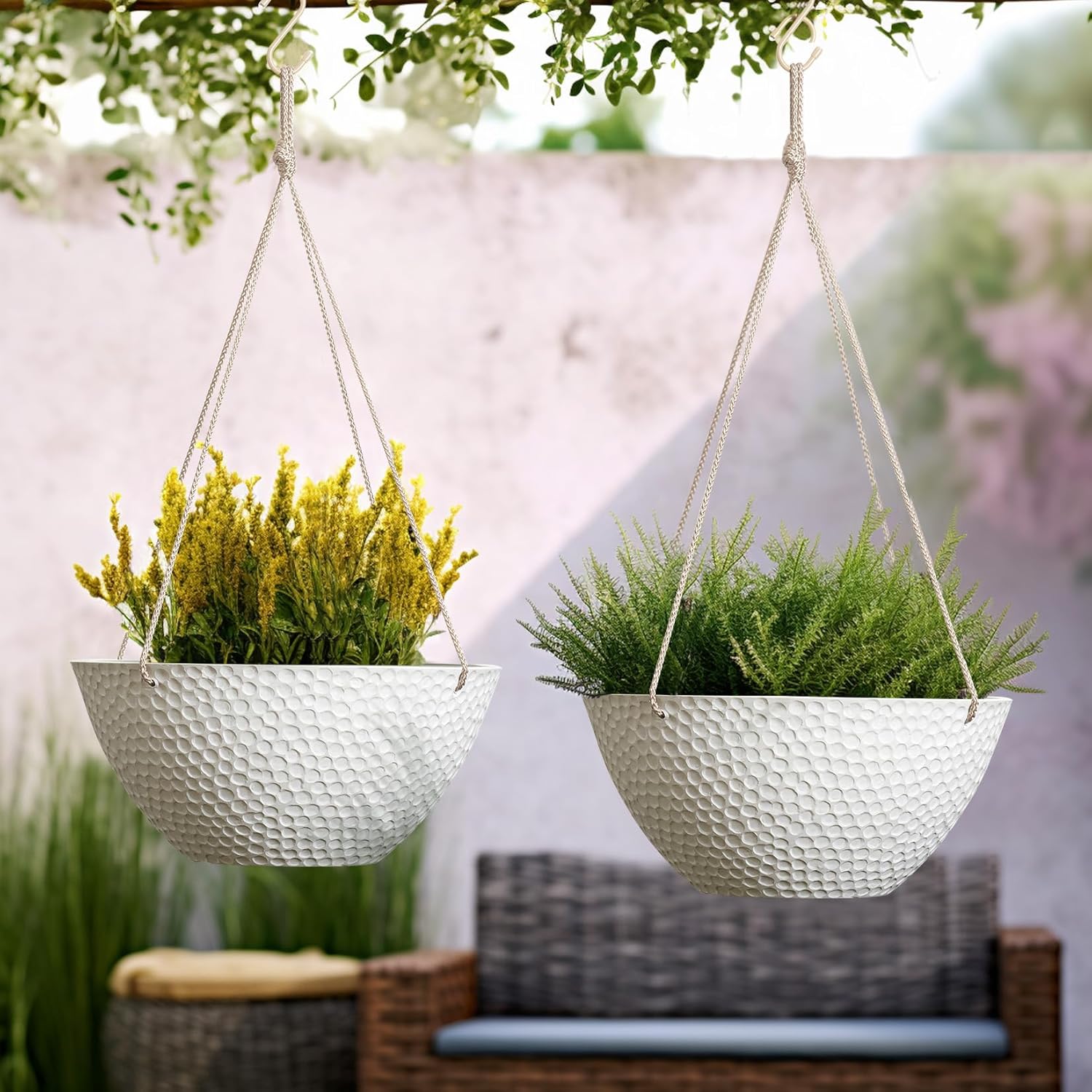 - WEATHER RESISTANT - Allow you to enjoy these hanging planters for outdoor plants in all types of weather. Built to withstand intense sun and harsh winter temperatures, free from fade, frost, crack and peel damage. Suitable for both outdoor and indoor uses.