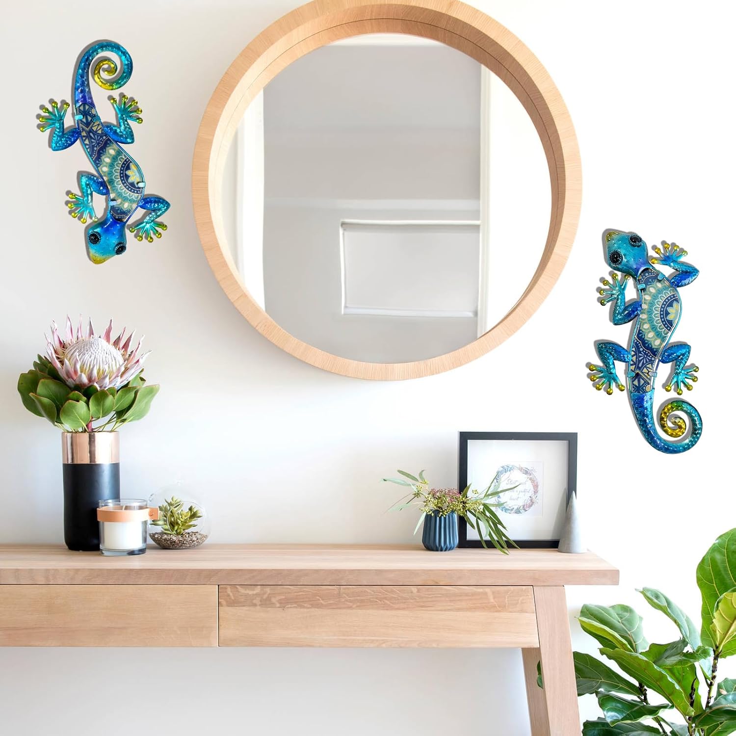 - 🦎【Material】Gecko wall decoration made from high quality metal which dealt with rust prevention and premium glass , with unique Bohemian design and clear presentation by glass printing technology. There is a two-way hook on the back, so you can hang the lizard in the desired direction