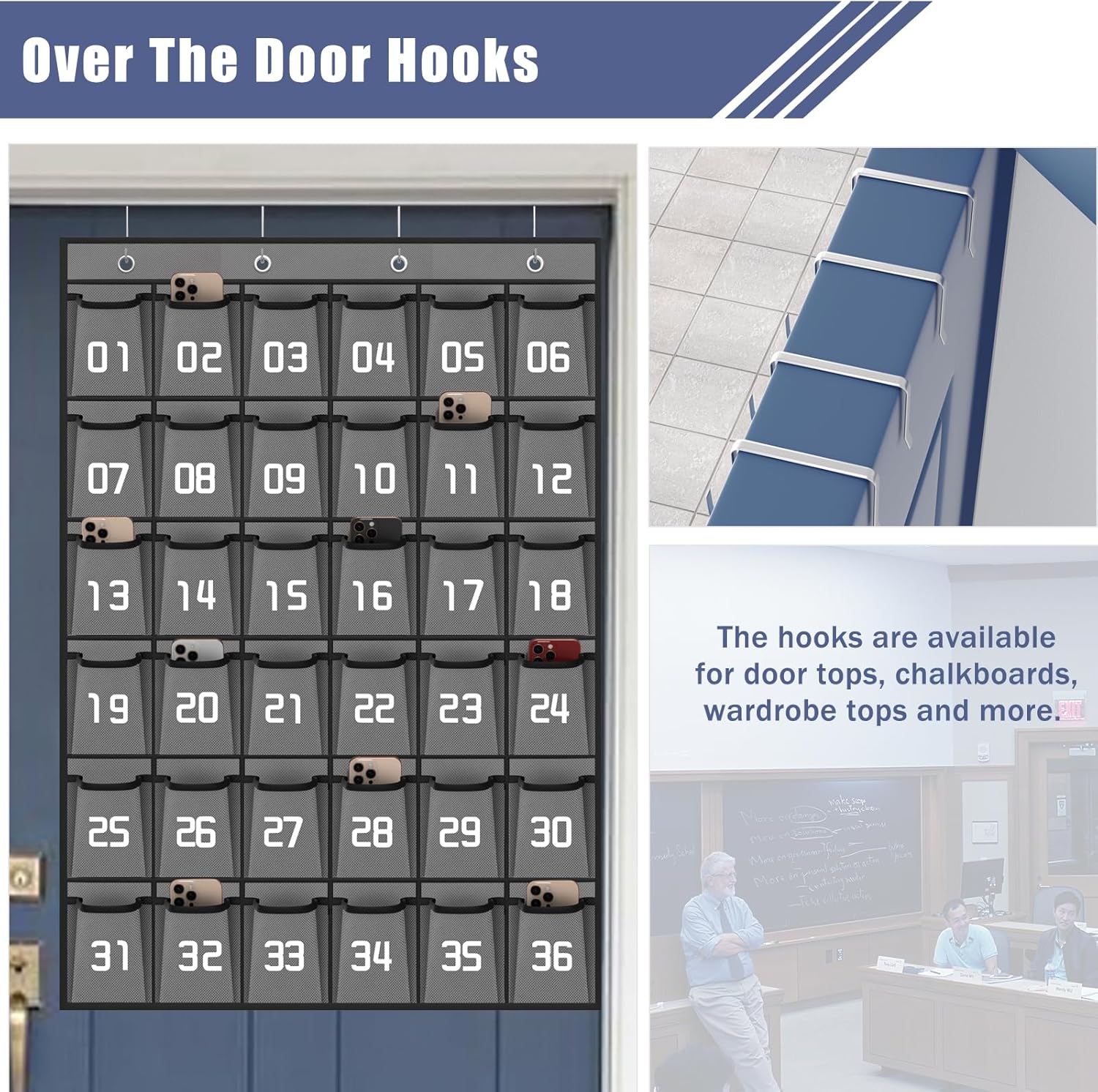 - 【4 Metal Hooks for Classroom Pocket Chart】 Calculator Phone pouch fit the top of whiteboard or over the door as thick as 1.3"-2", hanging organizer with pockets supports the weight of 36 phones (about 24 lb), easy to install and close the door