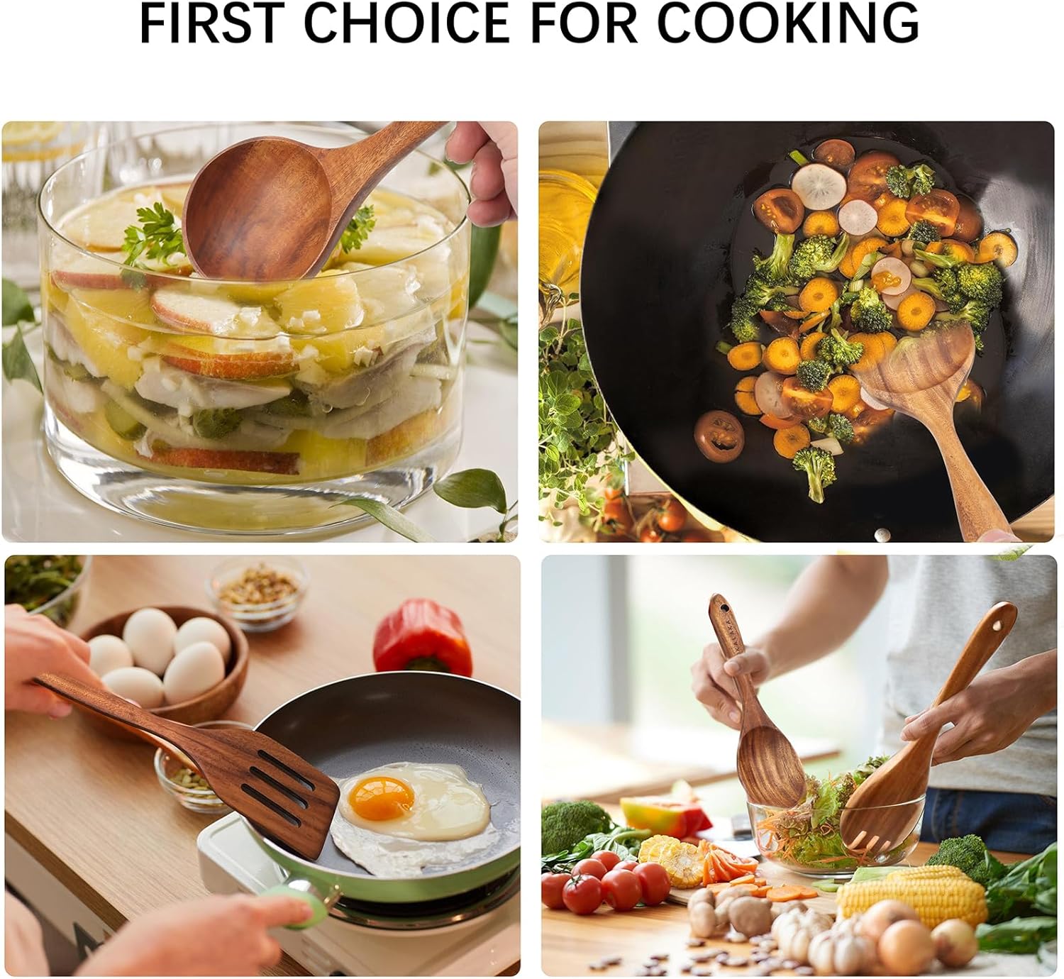 - 【100% Natural Teak Wood】Wooden utensils for cooking is made of 100% natural teak wood.This wood material is hard not easy to deform and crack.The surface is covered with unique and beautiful textures.Long-term use that is still bright as new.It’s a very high-end kitchenware set.It's loved by the majority of cooking enthusiasts.