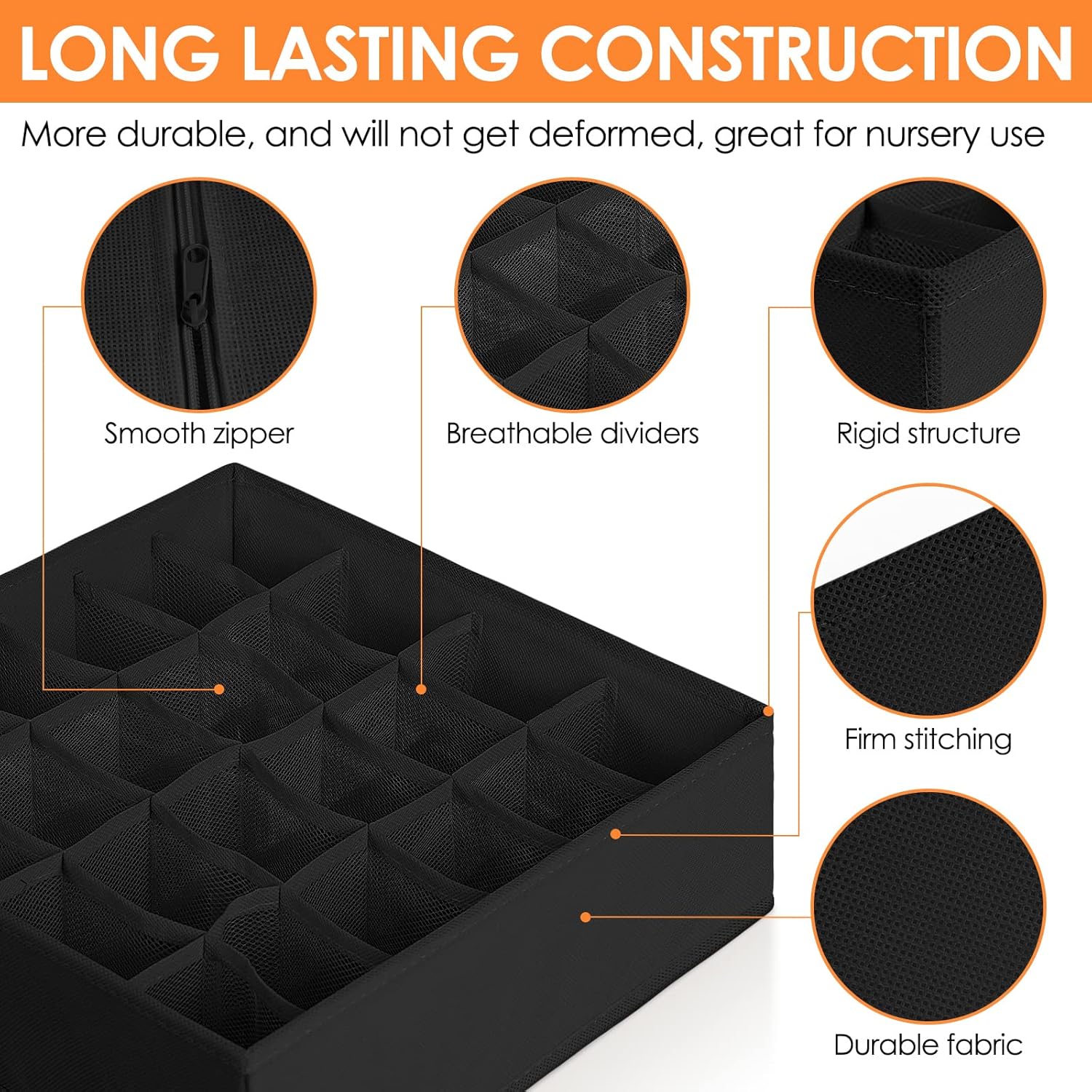 - ăQUALITY CONSTRUCTIONă Made of 80gsm thick non-woven fabric and reinforced stitching, our wardrobe clothes organizer is much more durable for long term use. 3.0mm Plastic boards added at the 4 sides are breathable and odorless, so great for nursery room use. Also sturdy enough, so stackable and not easy to deform.