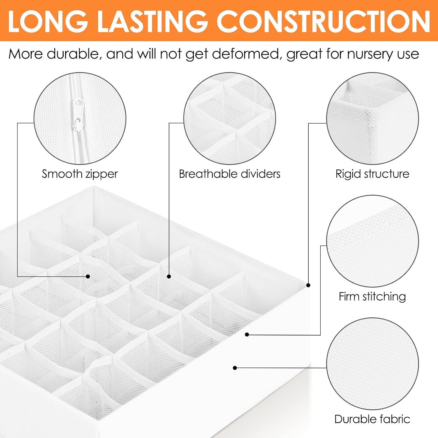 - ăFIT ALL DRAWERSăMeasuring 4" high, these dresser drawer organizers will perfectly fit with most of dresser drawers, sock underwear drawer. Totally 12 organizer bins, 2pcs 6-cell as shirt or bra organizer (up to C cup), 2pcs 24-cell as sock organizer, 4pcs 8-cell as tie underwear organizer, 4pcs 6-cell as scarf, belt, baby clothes drawer organizer.