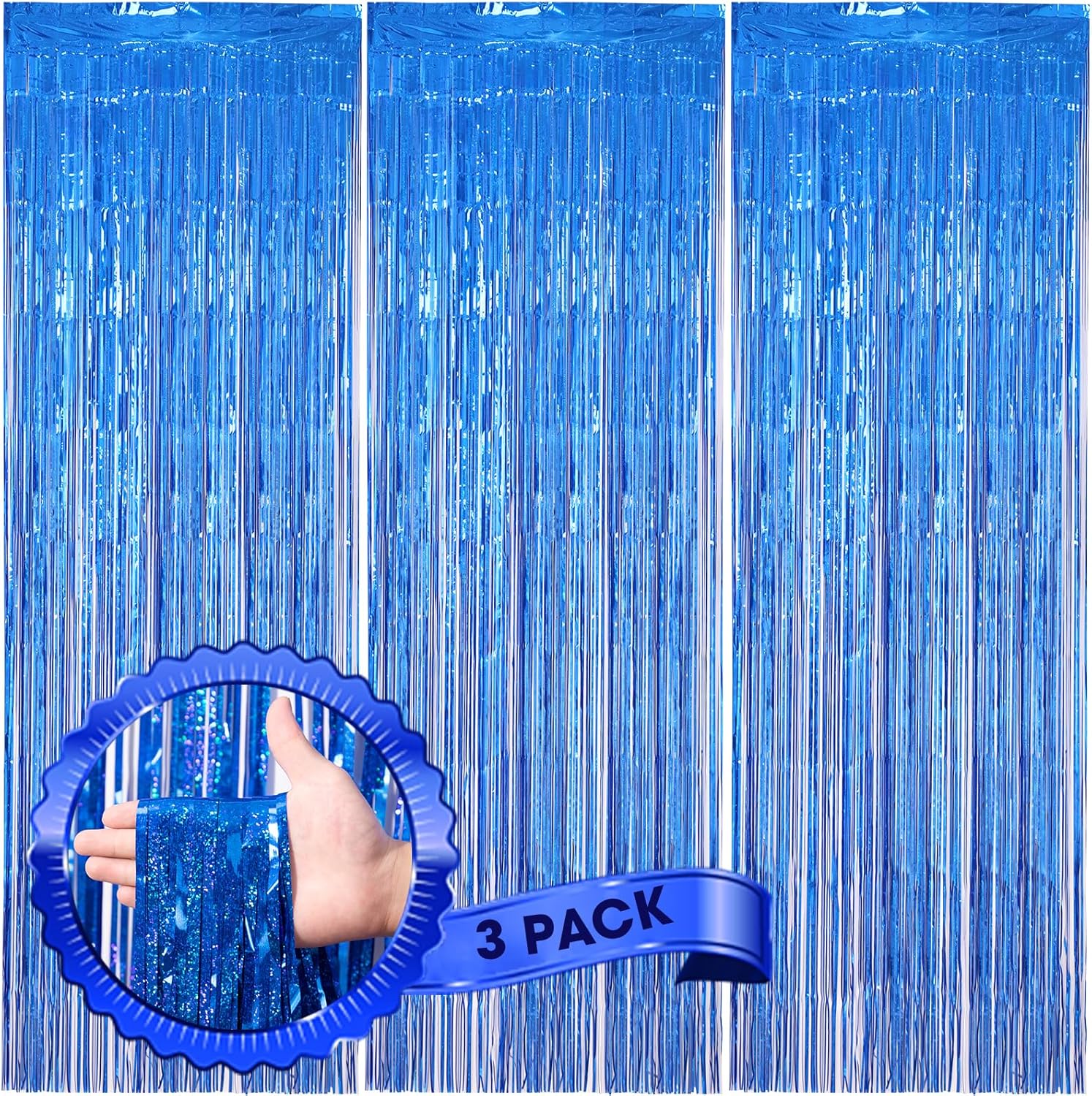 3 Pack 3.3 x 8.2 ft Laser Blue Foil Fringe Backdrop Curtains, Tinsel Streamers Birthday Party Decorations, Fringe Backdrop for Graduation, Baby Shower, Gender Reveal, Disco Party