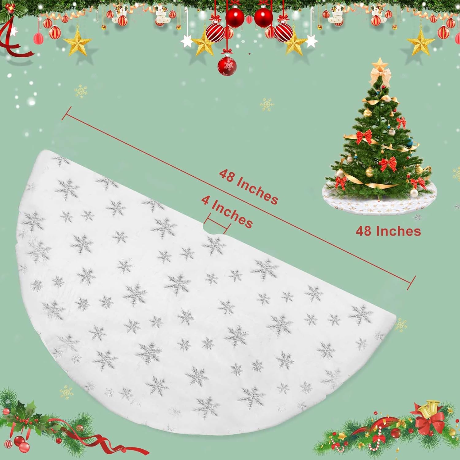 - Ideal Christmas decoration: Double layer design, back with non-woven fabric and front with Short faux fur. There are many silver sequined snowflakes on the white christmas tree skirt, like snow falling on the ground.