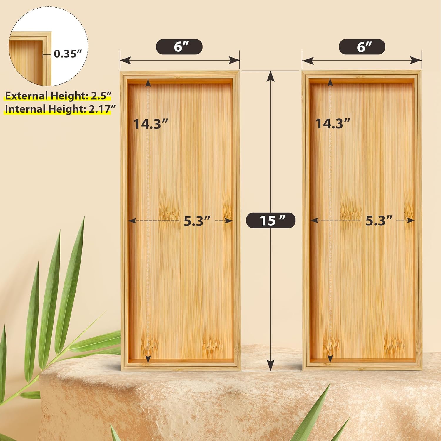 - PACKAGE ONLY CONTAINS 2 BAMBOO DRAWER ORGANIZERS (NO SILVERWARE)! PLEASE, REFER TO THE SIZE WE LISTED: EXTERNAL SIZE: 15" L x 6" W x 2.5" H; INTERNAL SIZE: 14.3" L x 5.3" W x 2.17" H, AND MEASURE YOUR DRAWER OR ITEMS FIRST