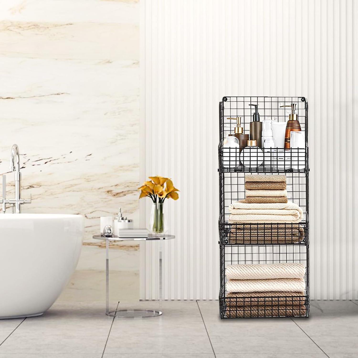 - 【Perfect Storage Organization】Metal basket hanging shelves provide a great storage solution for any room in the home. Organize clothes accessories and toys in your closet, lotions in your bathroom, containers in your pantry, office supplies, mails in your office, fruit&vegetable&spices in your kitchen.
