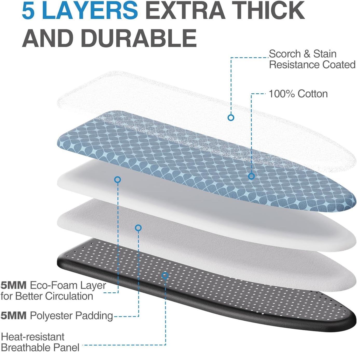 - Innovative Triple Layer Cover: The ingenious fusion of 5mm needle-punch cotton, 5mm sponge padding, and high-quality heat-resistant fabric creates an innovative combination that guarantees swift and flawless results, doubling your ironing speed time.