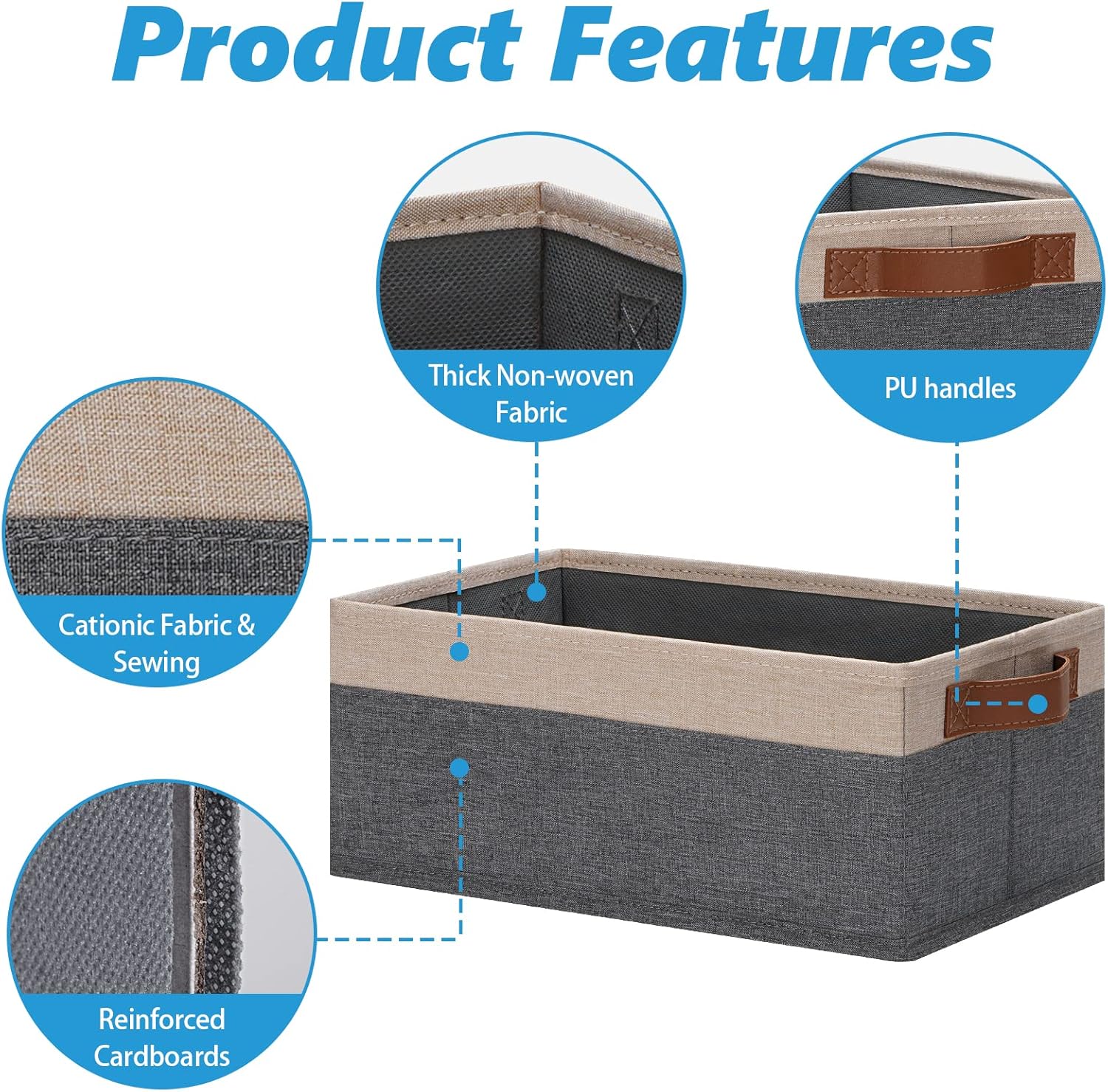 - 👍【QUALITY MATERIAL】Storage baskets for shelves are made of high-quality cationic fabric and polyester cotton fabric, and the inner layer is made of non-woven fabric, which is odorless, durable and strong. Classic faux leather handles that adds a comfortable touch and provides a strong and comfort grip to pull and move. Fabric storage bins are easy to clean, just wipe with a damp sponge or cloth.