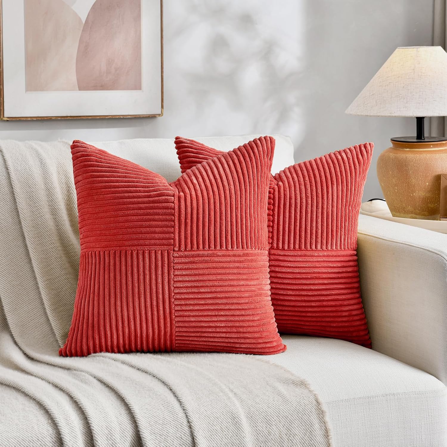 Fancy Homi 2 Packs Red Decorative Throw Pillow Covers 16x16 Inch for Living Room Couch Bed Sofa, Holiday Christmas Home Decor Gift, Soft Corss Patchwork Corduroy Textured Square Cushion Case 40x40 cm