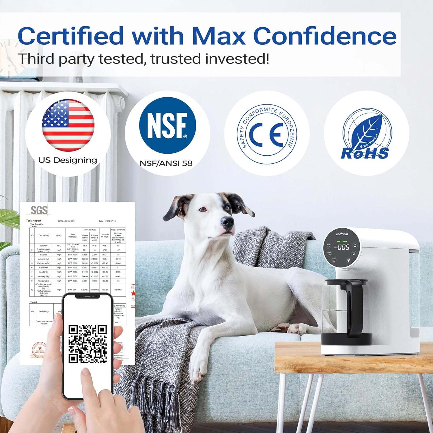 - SGS Tested Composite & Cycling Filtration: Meet NSF/ANSI 58 standards, test by SGS, the Ecoviva RO system features advanced composite filtration and a 0.0001ÎĽm RO membrane. Its cycling filtration enhances protection, while the coconut shell activated carbon post-filter effectively removes chlorine, delivering fresher, clearer water