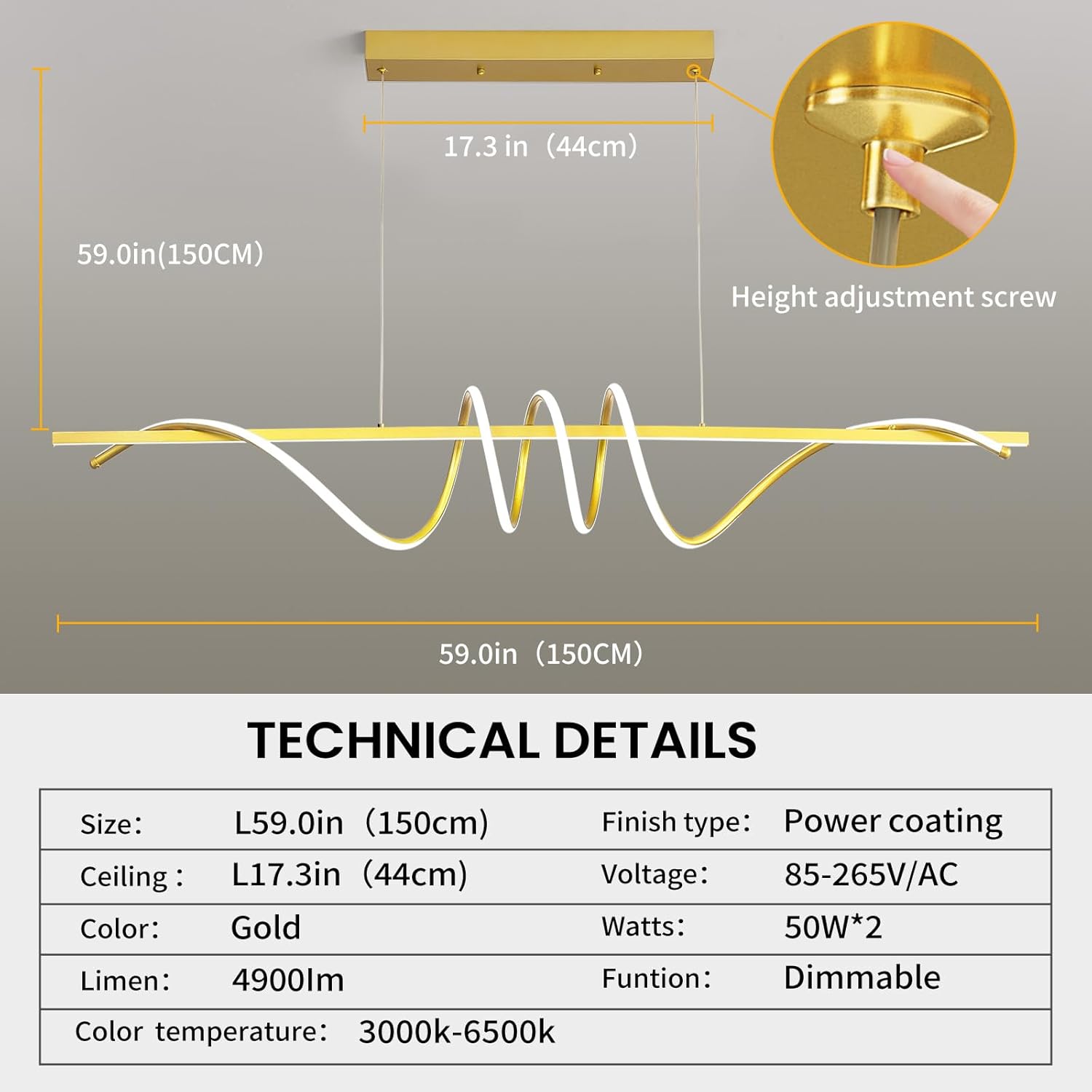 Modern Design Dimmable Desk Linear Pendant Light, with Remote Control Dimmable 3 Color Mode & Brightness Ceiling Lamp, Anti-Flicker Dining Light Fixture for Kitchen, Dining Room (Gold, 57IN)