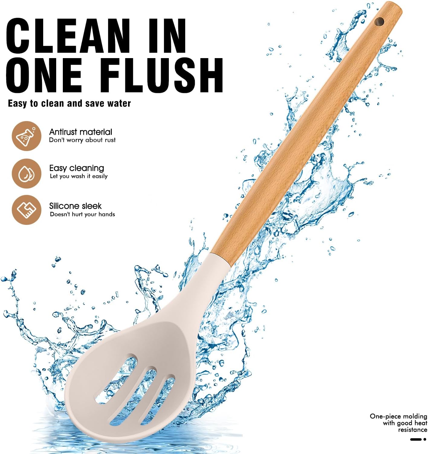 - NON-DEFORMABLE, EASY TO CLEAN: We've designed these silicone kitchen utensils sets with stainless steel cores wrapped in silicone for shape retention and flexibility. No warping or cracking, no hassle. The silicone utensils for coking one- piece construction ensures no pesky gaps where food can hide, making cleaning a breeze. Due to the unique nature of wooden handles, we recommend handwashing