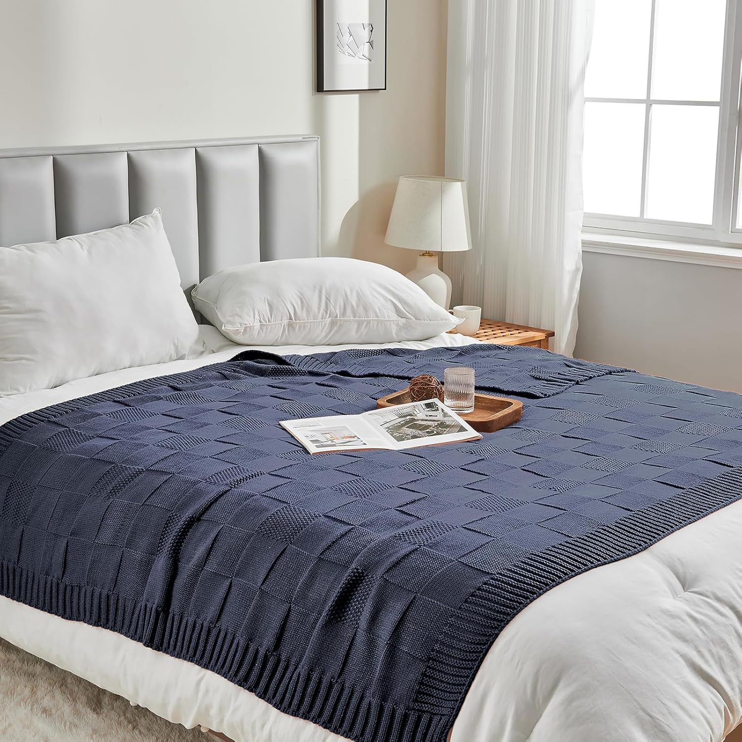 CozeCube Check Knit Throw Blanket, Steel Blue Checkered Throw for Couch, Decorative Christmas Soft Cozy Warm Knitted Blanket for Bed Sofa Living Room, 50"X60"