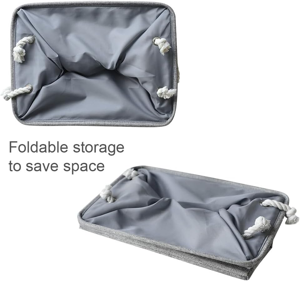 - Made of linen and thicken environmental EVA for reliable performance. Dimensions (each): 17 (L) x 15 (W) x 12 (H) inches.This collapsible basket set provides attractive, lightweight storage. Saves space when not in use and collapses flat for easy storage. It helps keep a room looking neat and tidy. The neutral color combination fits most dรฉcor while the two side carry handles make it easy to carry