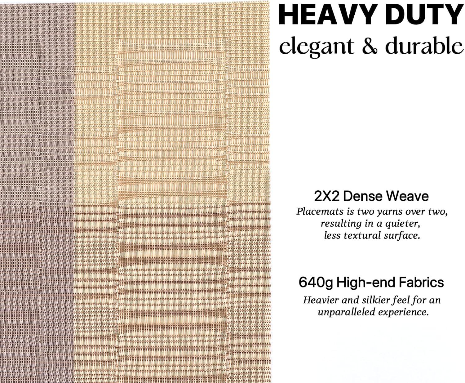 - HEAVY-DUTY:We uses the German-imported higher grammage vinyl material (Specialty PVC)than other placemats on the market,plus the precise,dense weave craftsmanship to give the woven placemats a thicker feel and make the place mats long-lasting.