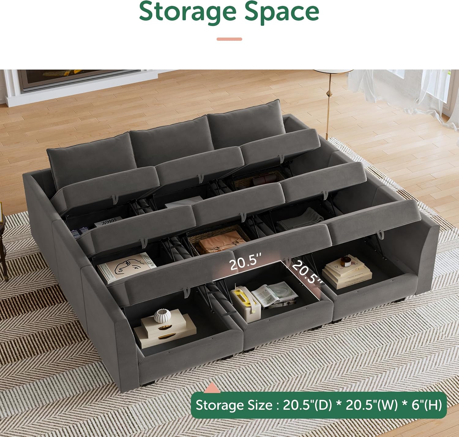 HONBAY Velvet Sectional Sofa Couch with Storage - Modular Sleeper for Living Room, Grey